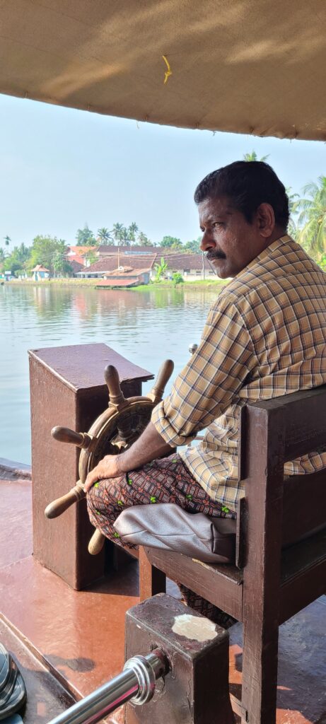 The cook returned and we started out around nine thirty. We passed by a few more churches including a St Thomas Orthodox Church, with a mural of Thomas seeing Jesus’ hands and believing he had been resurrected. But mostly just watched as normal life happens. People were out washing their laundry in the canal, some were cleaning breakfast dishes, a couple were bathing in their clothes; and one man I saw fishing. The ‘water-buses’ or ferries zigzagged back and forth moving people from one side of the canal to the other, or wherever further down the canal. It was relaxing and gave perprective to daily life. We did pull over once for the driver to go “shopping.” Jeff and I did a quick walk – have to work off some of this food! We all loaded back up and “putted” along. Our driver goes slowly, but steers well.