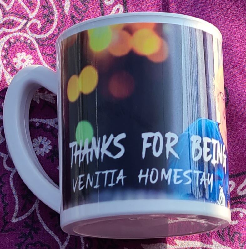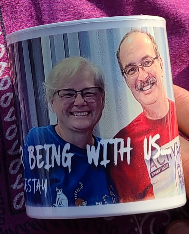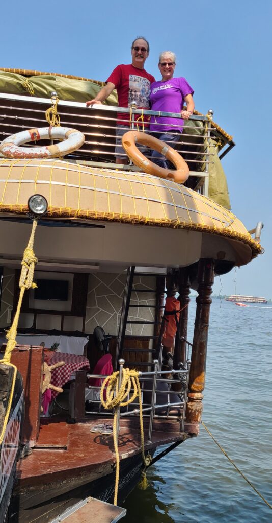Today we will leave homestay. We have an excursion for three nights on a private houseboat with couple of staff, who drive the boat and cook for us!! I’m ready for a new adventure. As we were saying goodbye they gave us a box. “Open, open,” they said. It was a mug with our picture on it!! Such a nice gesture and unexpected! We said goodbye to Jeeja. Francis went with us to the boat. At the docking area it is just boat after boat – so many! – and differing sizes! We boarded ours – ‘Oneness’. We were given a welcoming juice drink. The owner came and Francis introduced him, then Francis left saying goodbye. The owner talked with us a bit, and said “If any problems, call” and laid out his card. Jeff took a photo of it. Then he left and we are with two “staff” – one is the driver, the other the cook. We backed out around 1230.