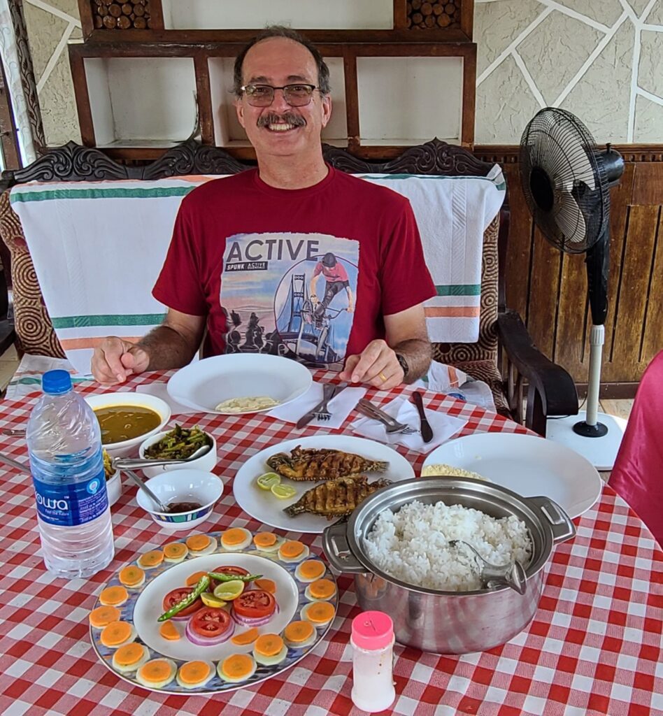 Around 730 we were served supper of: chicken (still with bones) in a very aromatic gravy; a stew; rice; pickled okra- that Jeff liked; a chapati- tortilla-like bread, still hot; and big bowl of fruit on the table. (We didn’t get to the fruit.) We will have to get more steps in, since we are eating so much!! Then I blogged and Jeff edited. It has been a fantastic day!
