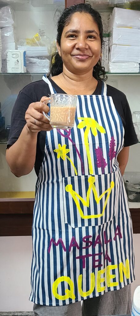 Today I felt better, but still drainage issues, especially at night. It always amazes me how much mucus colds can cause! Questions!!! Anyway, we readied and to breakfast. We were served Idli – which is steamed rice cakes with an orange coconut gravy; the bean dish – which is chickpeas in a savory sauce with parotta bread; the peas and coconut with a roti; and of course Deeja’s masala tea. It was all good, just again too much! As we were finishing Deeja and Francis actually sat with us having some tea. We were able to converse some. I had noticed a flower bouquet in their china hutch, and asked if it was her’s from their wedding – 20 years ago. It was! She brought it out and showed it was artificial flowers and lace. Upon replacing it she showed us an apron, in passing, with the label of ‘MASALA TEA QUEEN’. I asked her to put it on and snapped a picture. Yeah!! What fun! (Francis okayed me using it on our website.) Jeff and I think she deserves the title! (Francis’ dad is still in the hospital, but he’s okay!)