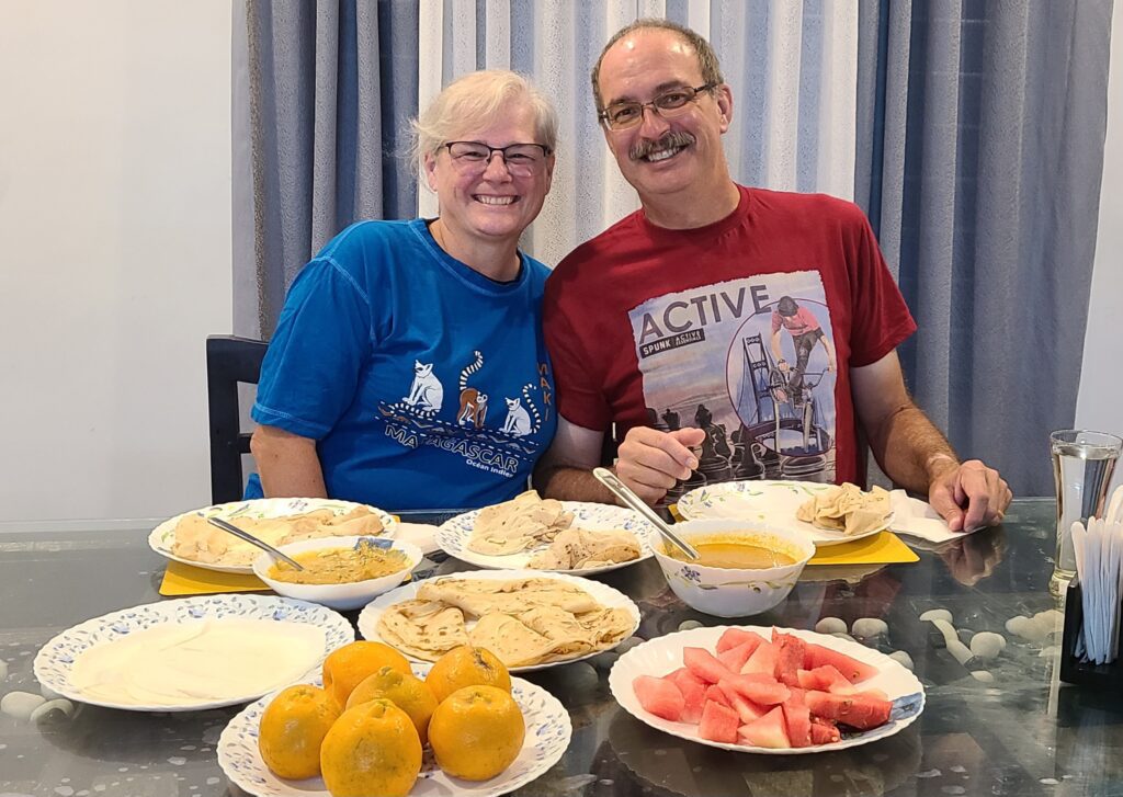 Around five we went back out for a swim and sunset. The water seemed warmer, but was great! Sunset was early due to a bank of clouds but it was nice. We will definitely do this more! We finished and went the five minute walk back to our place, then we showered and readied ourselves for dinner. We were served Paneer Masala and a spicy (for us) gravy. We also had three kinds of bread – parotta, rice bread (flat and very thin), and roti. Then there was fruit: watermelon, and tangelos. Very tasty meal!! 🙂