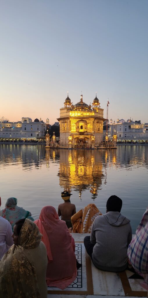 Now we just headed back to our place for a small siesta time. Deciding to take in the Golden Temple at night, we went in after we donned little orange head coverings provided. Wow! This one is truly more than the Temple we saw on our tour. And actually, this temple is a Sikh one. All the reading Jeff had done said to go at dusk, which we did. But well, it’s a Saturday and the place is packed!! So we did not go inside the temple itself. The line was very long! (We met people who have been many times and did not go inside the actual temple anymore because of the line.) So we just walked around the outside along the pool. For Sikhs this is a pilgrimage site and some were doing ritualistic baths in the pool. As we were walking around, there was a service being broadcast over loudspeakers and on big screens in the corners with English translation even. But the Temple just glistened in the setting sun. Then the lights came on and it glistened more. Very beautiful!