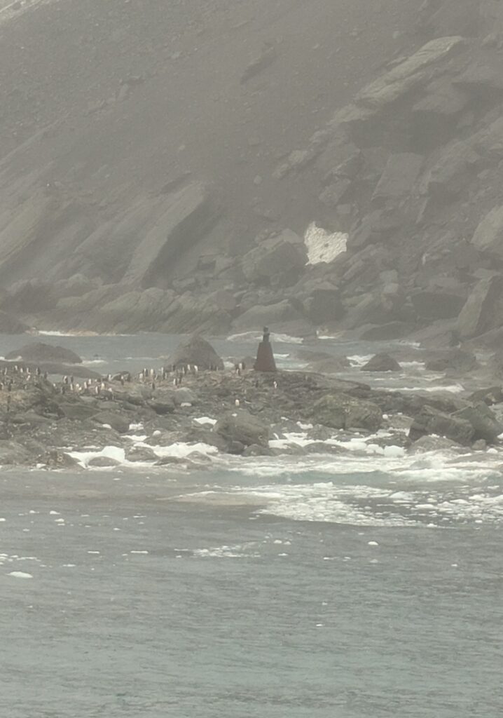 Jeff went on up to the Dome. I readied and went up as well as many passengers of the ship. I arrived just in time. A thick fog was rolling in and within ten minutes had enveloped the island, hiding it from view! Natalia shared the story of Shackleton and his 28 member crew. Our boat moved on as she related history. The men arrived here because winds carried them here. They had intended to only go to Paulet Island because there were supplies there. But the current and the wind didn’t allow it. As soon as they landed on Elephant Island bad weather hit them. They moved to Point Wild, further around on Elephant Island, for a bit better protection and ate a whole Elephant Seal they roasted. It was the first, real meal that they eaten – that had filled their bellies for quite awhile. Then Shackleton asked for volunteers to go to South Georgia – everyone put in to go. But he only chose six – the best that most likely could endure. The other 22 – he left with three small boats for their shelter, and a promise to return for them. After around 120 days, Shackleton was able to return and rescue them(after three failed attempts).