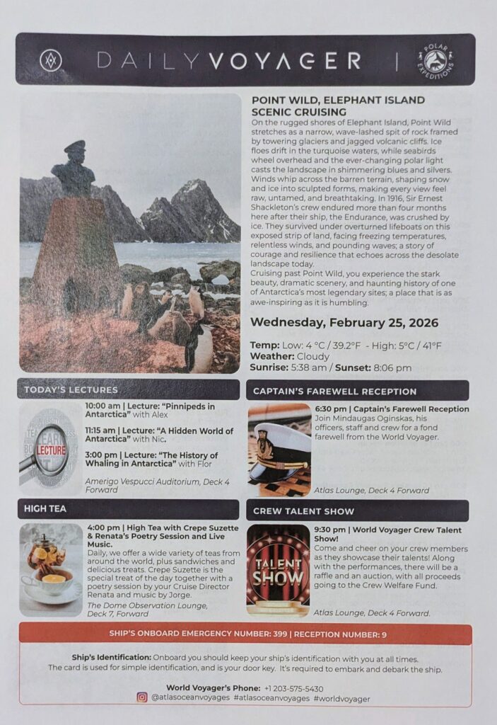 I awoke again with Chad announcing stuff. It was 0600! It seems we have arrived at Elephant Island. This is where Shackleton’s group arrived in four small boats.