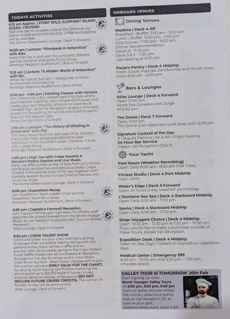 At 1800, we had the Briefing and Recap with three mini lectures. One on the Chilean Captain by Hans. Second on Babies in Antarctica, given by Anastasia. This was fun because it on 11 human babies that were born here (three from Chile & eight from Argentina)!! Third and last lecture was Sarah on The Ice Memory Project, protecting ice core samples. Then Chad briefed us in tomorrow’s schedule. At 1830, we had the Captain’s Farewell. The Captain said we had done 3,200 nautical miles; six days in the Drake Passage- will do total of eight; and had 12 operations anticipated and completed!