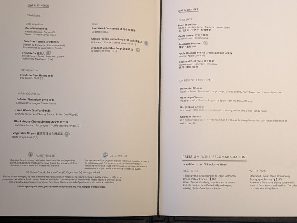 Then dinner. The starters of French Onion Soup, and Falafel with sweet potato puree and Chanterelle mushrooms. For the mains: Fried Whole Quail with Chinese savory & sweet sauce and boiled quail eggs; Black Angus Chateaubriand with foie gras sauce asparagus and truffle mashed potato. The night ended with a Crew Talent Show. I went but Jeff did not. Renata, Cruise Director sang, In other words I love you, and Wonderful World; Adrian Food producer sang, 16 Tons. A female (I didn’t get her name) Restaurant Staff, did a Balinese dance; Adolfor, Inventory Controller solved a Rubik’s cube- 2 handed in 45 seconds, and then 1 handed in 64 seconds. Wilson, Restaurant Staff sang, La Bomba; David, bartender sang a song he wrote of love gone wrong, hilarious; John Carlo, Restaurant staff sang a song by John Legend, Save a Little?; and Crazy Little Thing Called Love by Queen; Jorge, Restaurant staff, did the Tequila song; Sheila (who knows everyone’s name on board!) sang APT with joining in John Carlo. Then some with the audience did the Macarena. During this show they had a raffle with prices and a bid on the painting done by Victoria that went for $3,000 (that money was a donation for staff emergency fund, and was compensated with a $3,000 credit on Atlas voyages for future cruises.)