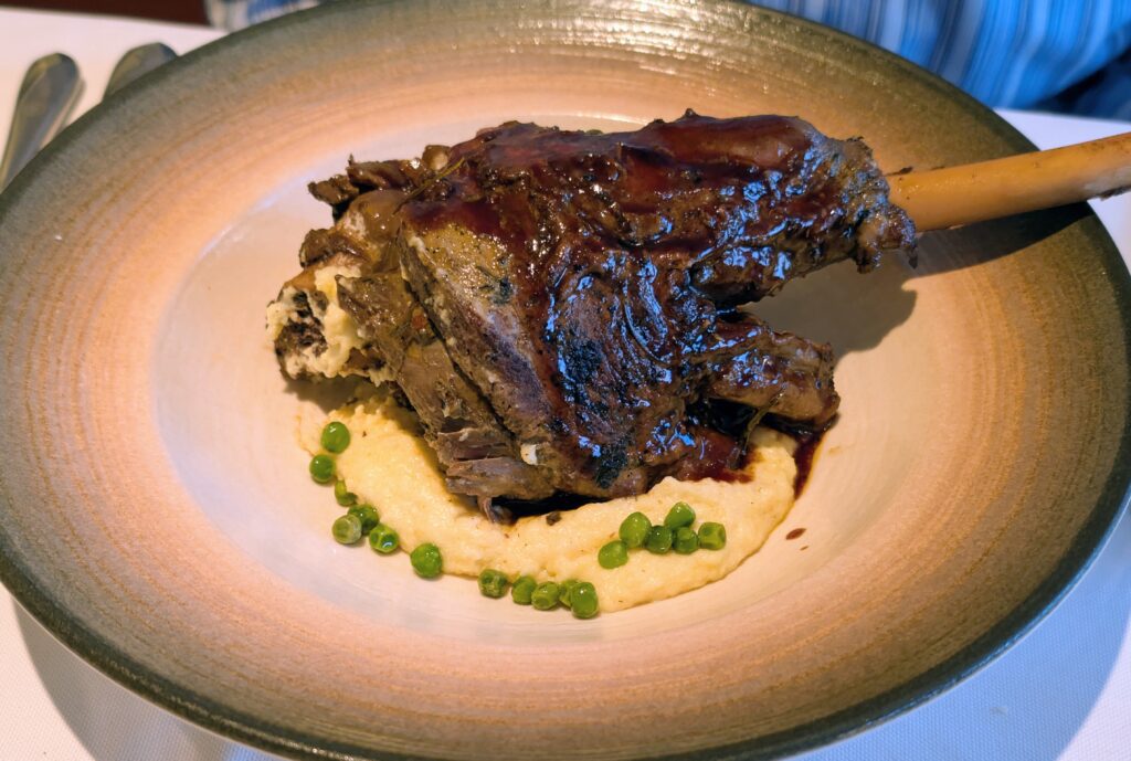 We then went to our last dinner. We had starters: Cherry Tomato Salad, Caesars Salad, Spicy Garlic Shrimp, and Cream of Onion Soup. The mains: Slow Roasted Lamb Shank with creamy polenta and peas; and Chanterelle Ravioli Pasta in a mushroom foam with walnuts. Excellent last supper!
