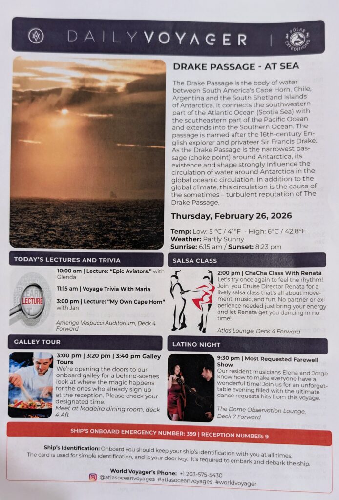I had a siesta. Jeff read. We had a late lunch from Paula’s Pantry, a pulled pork sandwich. Due to the weather and the rocking and rolling, the afternoon Cha-cha session & Galley tours were cancelled. We also posted a blog during this time…we think. We ran out of data on our internet, so not sure if it was successful – will check it later. We watched Jan’s lecture – My Own Cape Horn. He came from Hoorn, Netherlands, which Cape Horn is named for.