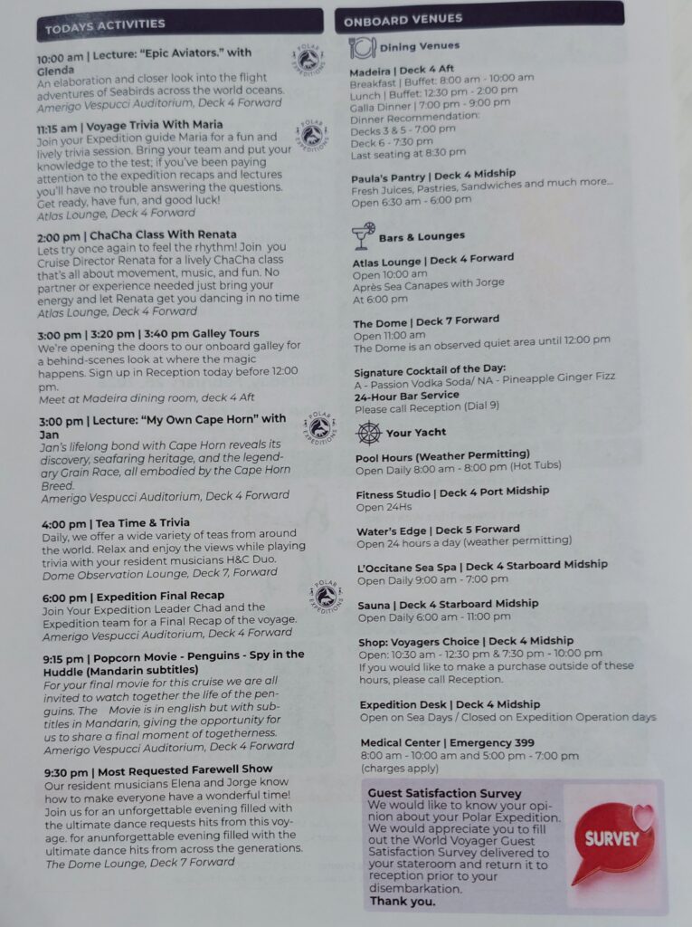 At 1800, we went to our last Briefing and Recap. All the Expedition Leaders showed their personal takeaway images of this trip. Flor’s best was with us, our very first Zodiac ride! The last person to show was Jose. He showed a video, which will likely be the video we will receive. It was super! Then all the leaders came on stage as we applauded them.