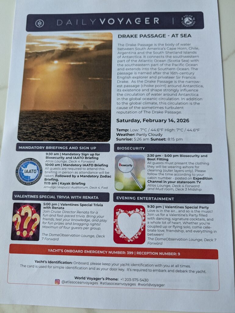 At 1445 we were to report to have a Mandatory Biosecurity and Boot Fitting. We had to bring our outer layers of clothing – if not new – for inspection of seeds dirt or invasive species. Then we went to the mud room and tried on our parkas and boots. Their sizing charts were spot on and fit us well. So it went well. Next was an optional lecture- “The Ultimate Survival Machine: Seabirds.”  It was fascinating, but a bit dry, speaking on mostly Albatroses, and a few other birds [Frigates, and Ganets(or Boobies) come to mind]. Then we had a light “hearted” Valentines Trivia with our Cruise Director Renata. We manged to get 8 right answers out of 13 (we missed the first two questions) fun facts of Valentines day. Lastly we had a Expedition Recap and preview of tomorrow.