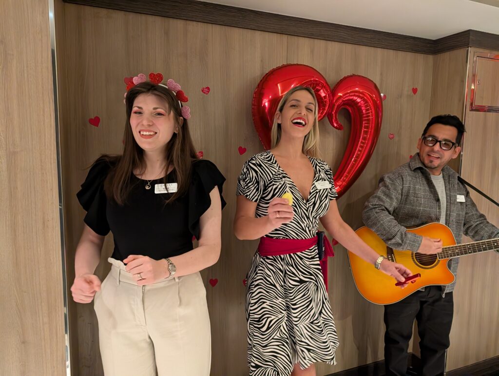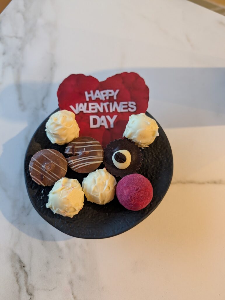 So today was Valentines’ Day. Jeff went and got our Javas at Paula’s Pantry. He loves me!! The coffee was a wee bit bitter for me though. I tried the pods in our room and preferred those. This is good because it will save Jeff from carrying two cups back to our room on the rocking boat! We readied and went to our first breakfast. It was set up as a buffet with menu options if you requested. We both just did the buffet. I had couple pieces of bacon; a roasted tomato wedge; couple of slices of homemade marinated salmon; some peppers, carrots, and cucumber with hummus; and a fresh pair. Jeff had about the same. We both are trying to limit our intake, because one can go…well “overboard”🤣, on the food consumption.