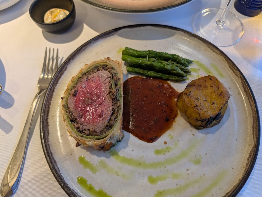 Next was lunch. We both had an assortment of meats offered: Slow-roasted Lamb Shoulder with lemon/herb sauce; Roasted Duck Breast with Szuchuan sauce; Silician Tuna Steak with tomato-olive ragout; and hand-carved Crispy Roast Pork. We had little bits of each with some bits of salads and sides. We each had a red wine. Lovely!