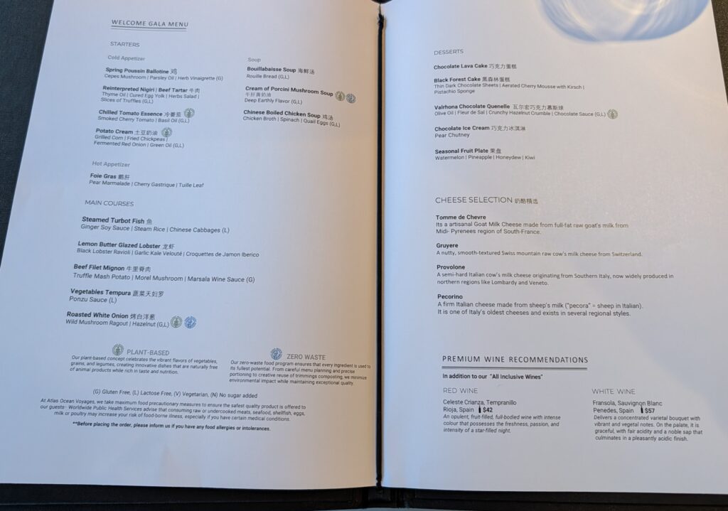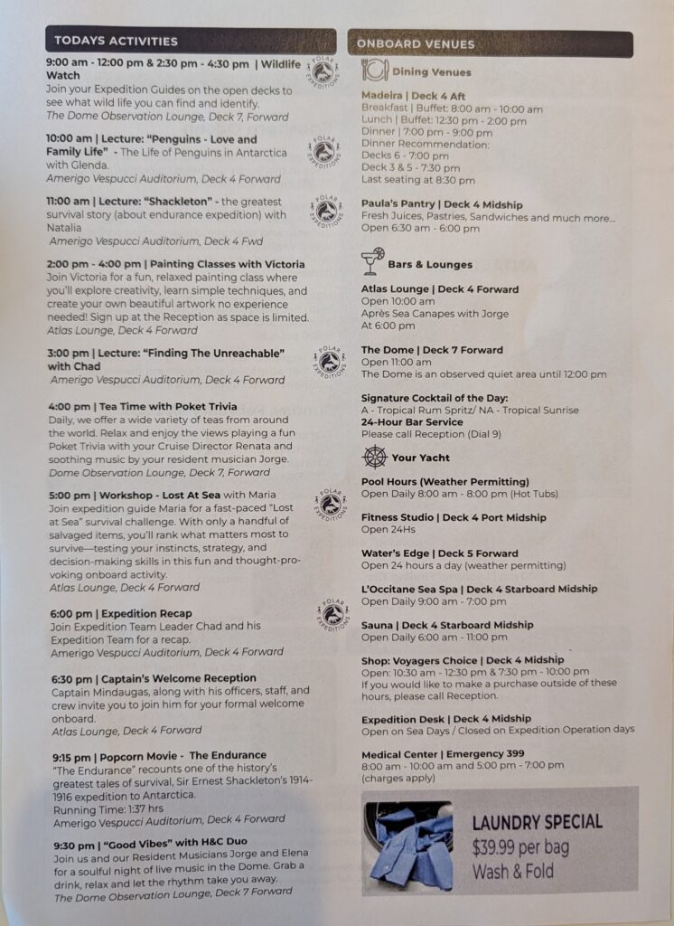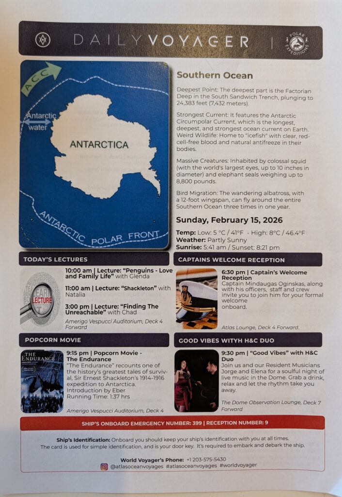 We watched a lecture on the TV from our cabin. It was Chad, talking on “Finding the Unreachable,” finding Shackleton’s Endurance Boat in 2022. It was great and informative. Then we had a siesta. At 1800 we watched the Expedition recap on the telly. One of the crew showed the (Beaufort) scale. It measures weather and swells of the water. He said we are about a #6, out of 0-12. At 1830 we went out to a Captain’s Welcome Reception. Our Captain, Mindaugas Oginskas (Lithuanian), introduced himself and his officers, some of the staff and crew. He mentioned many other stats…highlights: our yacht is a 1B ice class vessel, there are 134 crew, 170 guests from 29 different nationalities. Some breakdown 72 USA, 60 Chinese (tomorrow is Chinese New Year), at least 8 UK and maybe 8 Indians. We all where given champagne and he gave a toast to which we all saluted. Then the Captain came to every group and at least said hi.