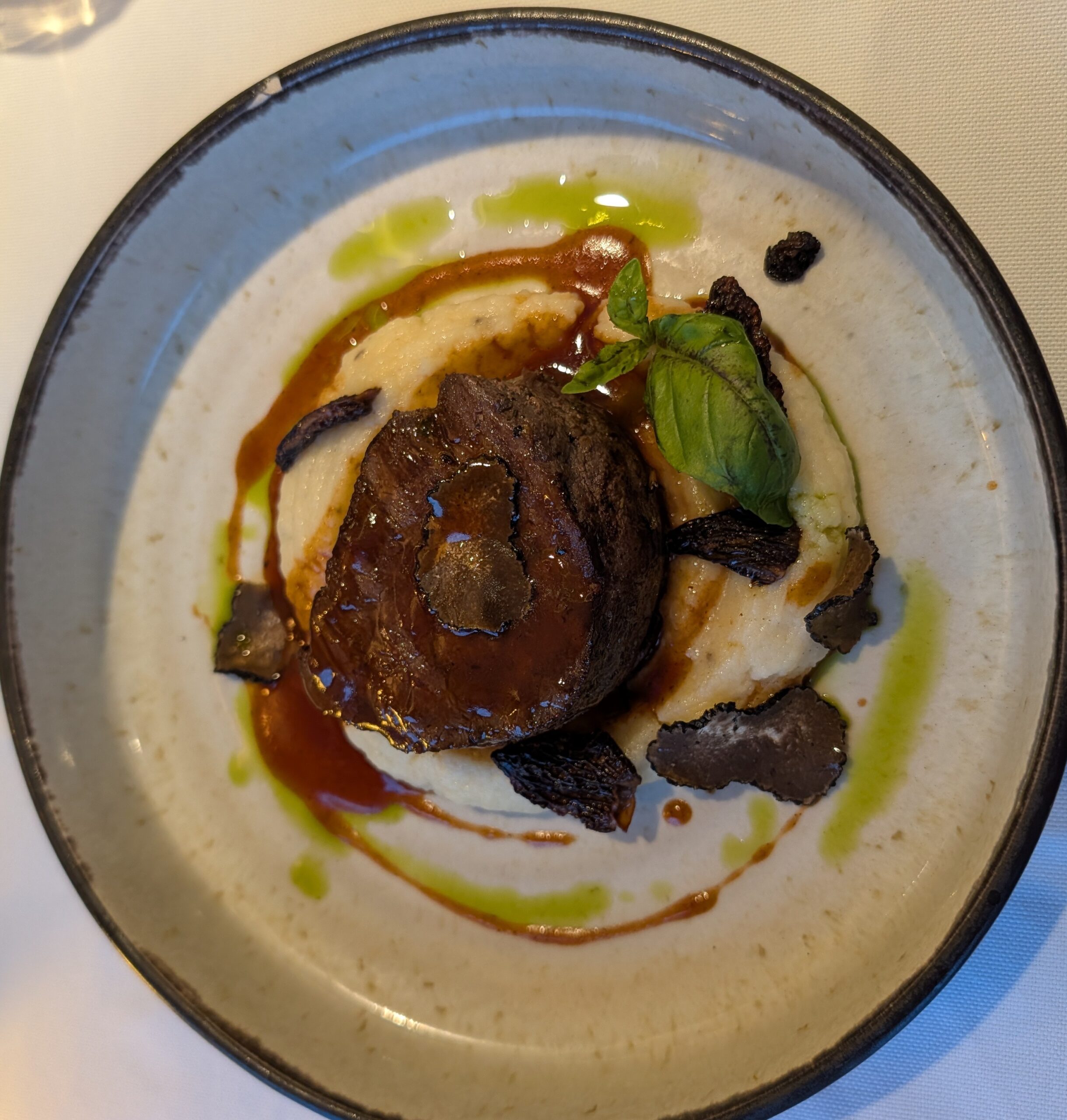 Supper was our first full meal today, and was great as all the meals have been. We shared two appetizers- Spring Poussin Ballotine (Cepes mushroom, parsley oil with herb vinaigrette) and Cream of Porcini Mushroom Soup; and then two mains- Steamed Turbot Fish with ginger soy sauce over rice & Chinese cabbage, and Beef Filet Mignon with truffle mash potato, Morel mushrooms & Marsala wine sauce. Then we had two desserts: Valhona Chocolate Quenelle- like a chocolate mousse with olive oil drizzle, sea salt, & hazelnut crumble on layer of dark Chocolate sauce; and a cheese selection with pecans and dried fruit (not sure which cheese it was, but was only one kind not the four that were listed).
