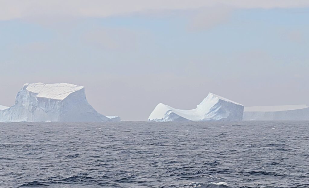 As we were getting around and at 0815 the Captain announced sighting of our first iceberg off of our port – left – side. We could see it from our balcony! So we rushed out to the bow – front – of the yacht. Yay!! So majestic! Once out of view we went to breakfast. I had a “croiffle,” which was a croissant/waffle with with cream cheese, Nordic cured salmon, pickled red onion, seasonal greens, and citrus. It was labeled as a popular South Korean fusion. Jeff had Shakshuka, a north African traditional culinary heritage, which was a tomato, bell pepper cassoulet with Ras el Hanout spice, poached eggs and artisanal bread. I had some coffee here and Jeff had some tea. We are taking Dramamine pretty much around the clock. The Captain had said earlier with the iceberg announcement that the storm has caught up with us and we are experiencing around twenty foot swells. But the swells are gentle, and with the medicine we seem okay. Walking though is a bit of a challenge.