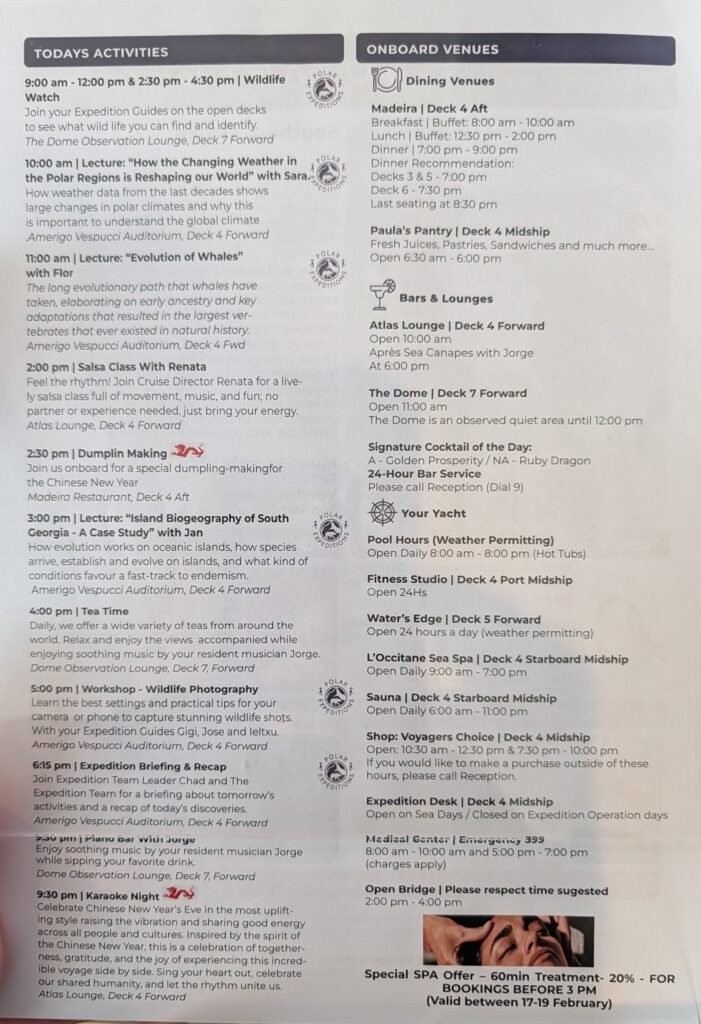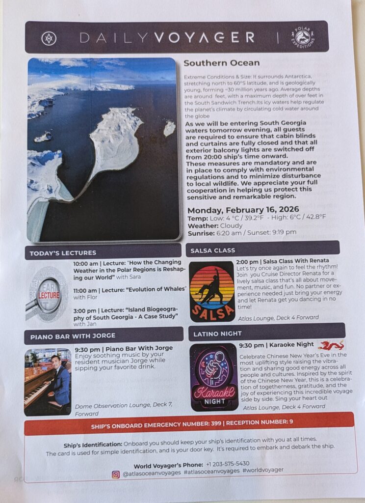 1815 we went for the Recap of the day and Briefing for tomorrow. We will be doing our first Zodiac excursions! First one in Godyhul (meaning Good Hollow) Harbor – a Zodiac cruise for an hour. Next the yacht will reposition in King Edward Cove, and an inspection of the yacht from South Georgia officials. Then the second excursion after lunch in the town of Grytviken. We will do a landing at Shackleton’s grave and walking one km to the old whaling station. YAHOO!!!