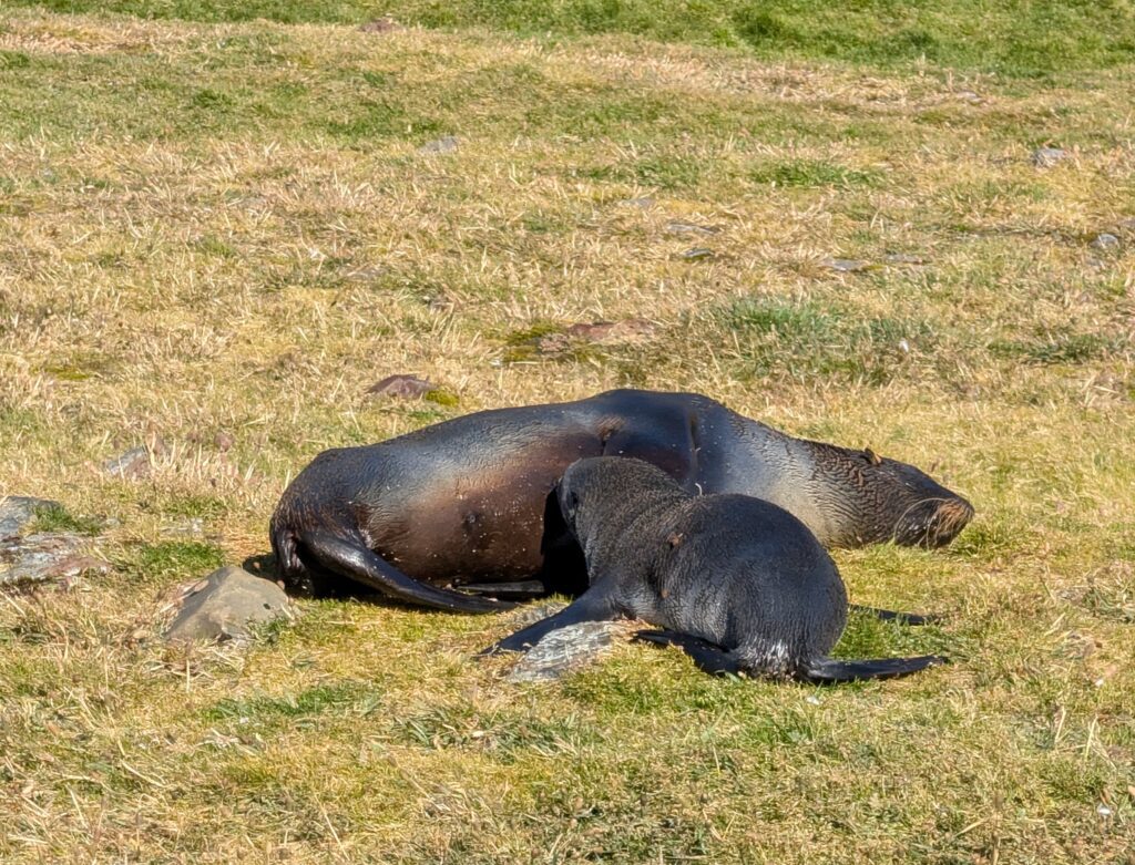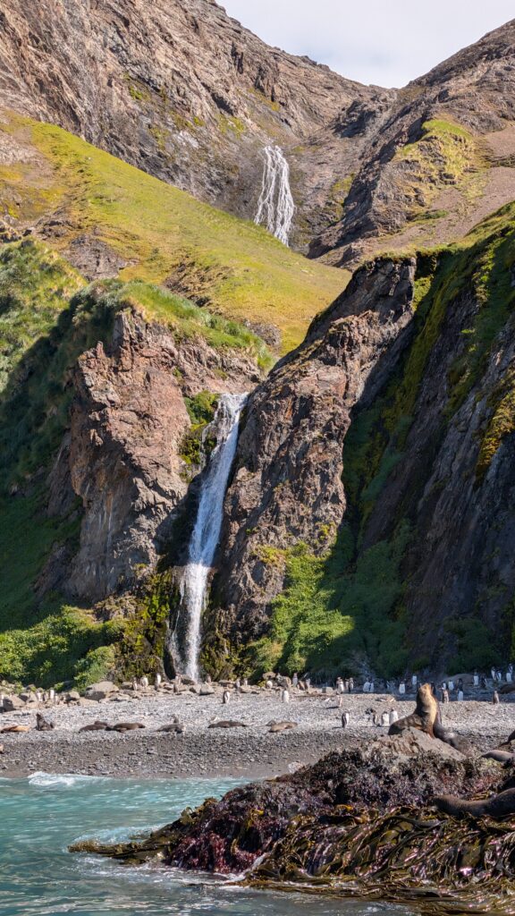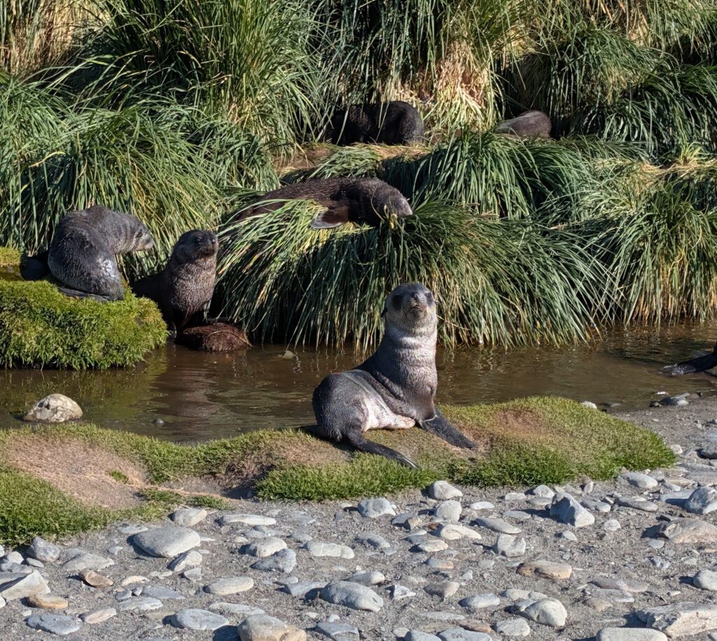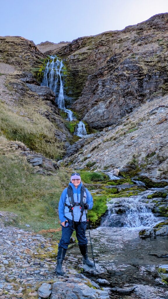 Anyway, we go on. There is a 2 km hike back to a waterfall. We followed the flags and cones as we walked by a few sparse groups of penguins and fur seal pups. They are gradually taking it back over. We came to a little pool of water with penguins “bathing”, then up a small hill about halfway. Just the small bit of elevation was a nice viewpoint. Onward to the waterfall passing by some staff, directing and answering questions. At the waterfall, we stopped, admired and were able to talk with Flor some. She made alive the story of Shackleton coming to the station. She told us we could touch the water at the base of the small waterfall and also of the tradition of wetting the back of your neck. So we did just that. Overall, what an experience to think of Shackleton and retrace some of his mishappened third polar venture! We then meandered back to get back on a Zodiac to the yacht.