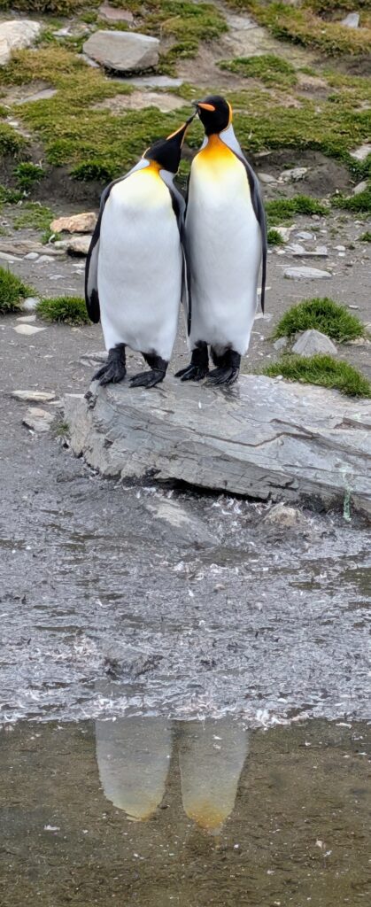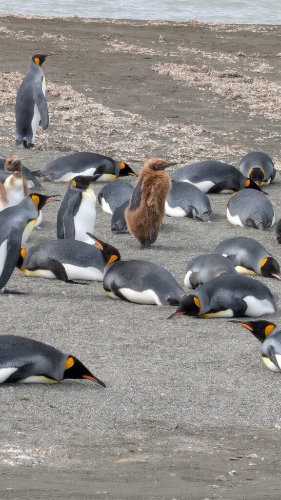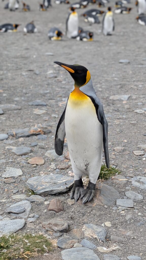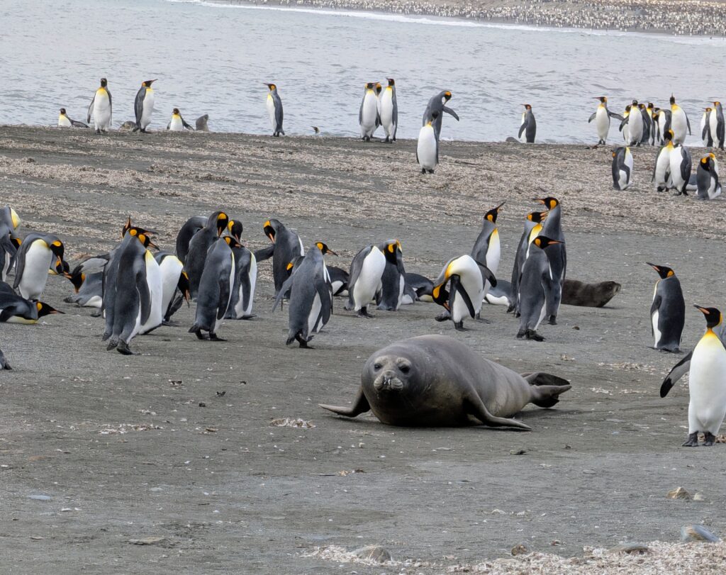 At 0915 we boarded a Zodiac and went to shore. We landed with a 1.25 venture. I felt the immediate realization that we were very few amongst 150,000 breeding pairs (and pre-pairing) penguins. This is one of the largest colonies of King Penguins in the world. It hit me as we followed our ‘cone/flag trek,’ that we were a “people highway” through a “city of penguins”… I like this analogy. We do have to gingerly make our way though because the penguins don’t recognize our highway. There are also Elephant Seals and Fur Seals.