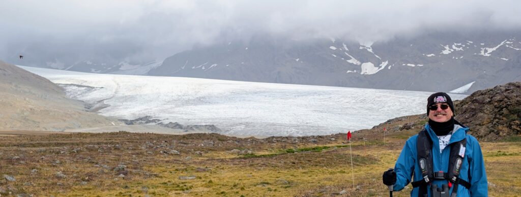 We made our way to the marked end of our trek, as we parallel, some dozen feet away, a stream lined with penguins. At the end of the destination, the guide Sara was there. We chatted a bit with her taking in the sweeping vistas of three glaciers- Cook, Buxton, and Heaney; “that once were one glacier centuries ago,” she said. I could make out the valley that this glacier carved to the ocean.