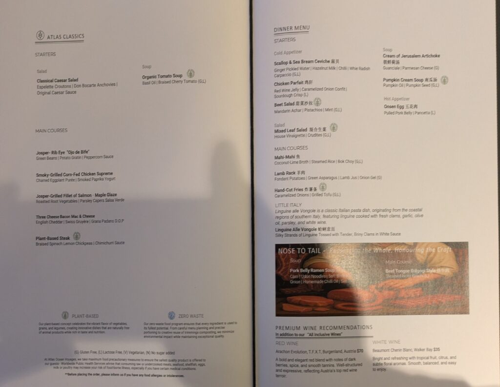 At 1915, we went to supper – did not seem as busy, maybe some were seasick as we were in open waters now. We each had a Soup- Cream of Jerusalem Artichoke; and Pumpkin Cream. I had Mahi-Mahi with rice and a coconut lime broth; Jeff had Lamb Rack with fondant of potato, asparagus,and a lamb jus with onion gel. We each had a Pinot noir and then shared a Dark Chocolate Souffle (64%) with hazelnut and chocolate sauce and a scoop of vanilla ice cream. After we finished, we went back to our room. Jeff went to bed (he might be getting a cold?). I blogged and then turned in by 2130.