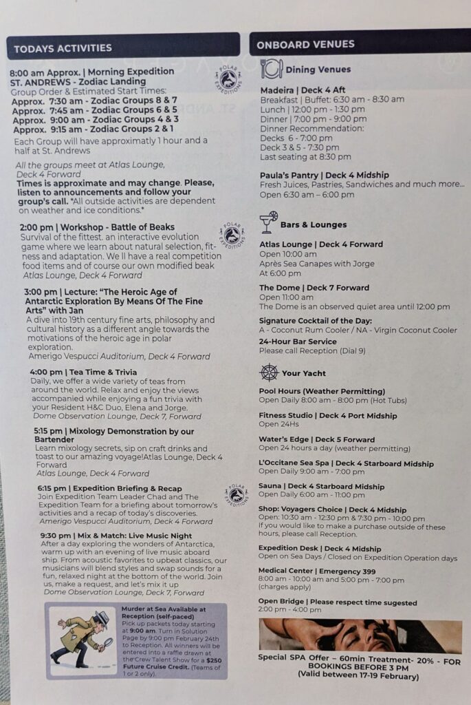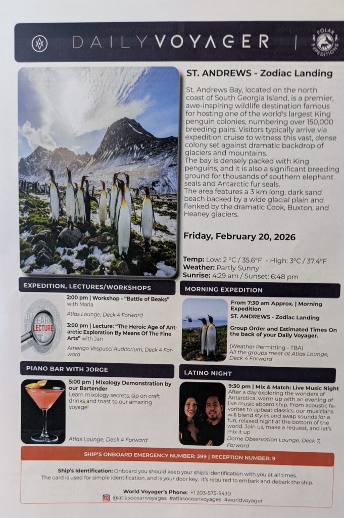 We skipped the 1400 lecture, but went for the 1500 one. Jan’s lecture was “The Heroic Age of Antarctic Exploration By Means of The Fine Arts- 19th century fine arts, philosophy, and cultural history referencing motivations of the heroic age in polar exploration. I find him a dynamic speaker and he made it fascinating. Then we went back to our room and took a precautionary Dramamine. Jeff had a siesta, as I watched a program on Antarctica. At 1600, Jeff went to a Mixology demonstration. I went to the Briefing/Recap at 1815. There were short talks by Alex, Glenda, & Isidro; then Chad followed with a briefing; an outline of tomorrow,an at sea day; and Q&A.