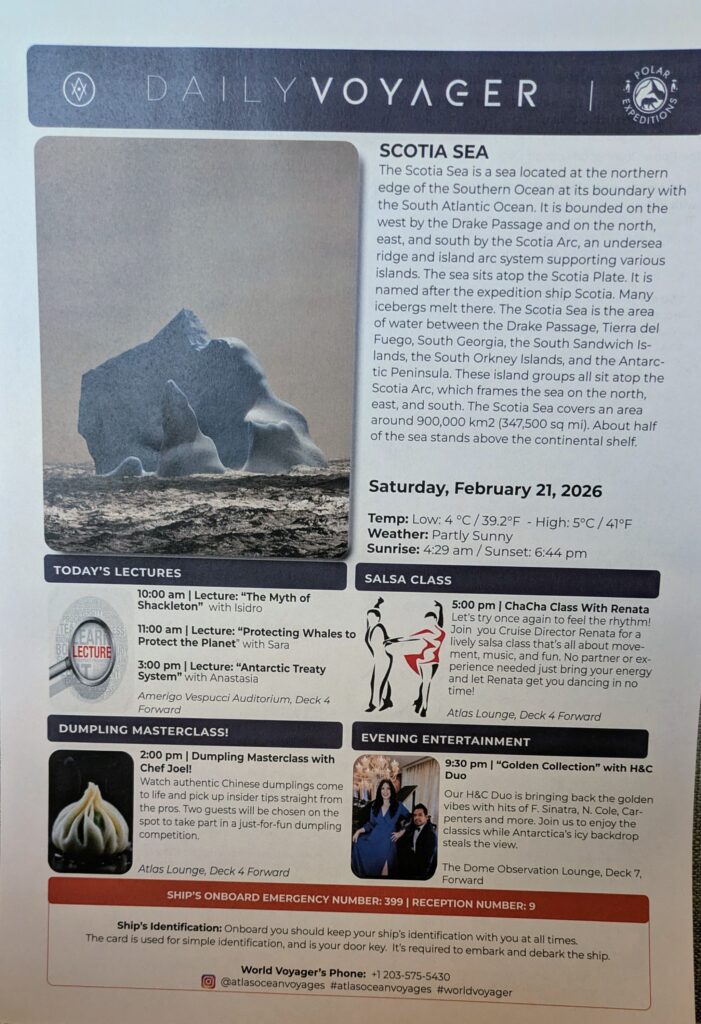 After lunch we went to the Dome to whale watch. The view is still a gray sky “shrouding” that meets the darker gray water. There was a bit of rocking and rolling, but it is not affecting us, and we’re not needing to take Dramamine. We did spot some icebergs, otherwise it’s just sky and sea. At 1330, we were rewarded with half a dozen whale blow spouts in the distance. Don’t know what whales they were, but it did happen.Yay! Then really nothing, so around 1600, we went back to our room. Wouldn’t you know, just 15-20 minutes later, Chad announced that an “iceberg off of our port side, that had broken off from the Weddell Sea had come to meet us.” We rushed back up to see it and were rewarded to see it!