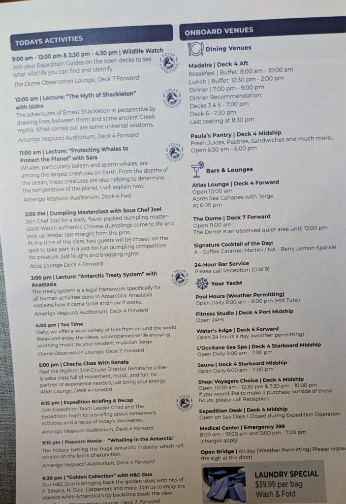 At 1815 we went to the Briefing and Recap for today. There were three mini-segments by three presenters. First was Flor on Lichens and their relationship in South Georgia. Next was Jan on the Water Cycle. His talks are always fascinating. The amount of salt water to fresh water compared to the density of the earth was way less than I thought. Because I always have heard it compared to just the earth’s surface. And lastly was Maria on South Georgia Habitat Restoration – they eliminated rats and reindeer! Both had been brought by man through seven major whaling stations. A major feat!