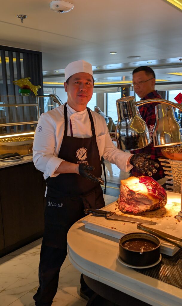 Then Jeff came and joined me in the Atlas Lounge to try the drink of the day – Coffee Caramel Martini. We chatted a bit with the young couple from London. Then we went to lunch. I had shredded veggie soup and carving of Porchetta Ham with rosemary sauce with small sides: cold grilled asparagus salad, and hot veggies of brussel sprouts, cauliflower and onion. Jeff had, in addition, Wild Boar stew with the asparagus. For dessert we shared a piece of chocolate raspberry tart, and coconut flan.