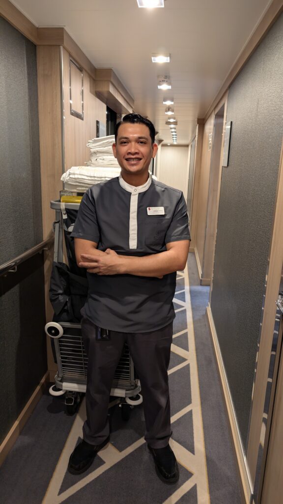 Up and readied for a day at sea. The view out our balcony is just gray sky meeting the sea. We had ordered a room service breakfast of a Western Omelet, Muesli, yogurt, and a side of bacon. The food was delivered just after 0830. It was good and pleasant to just sit by ourselves in peace and eat. Jeff has a bit of a sore throat and is coughing some. Our laundry was delivered, fresh and clean by our house steward, Dewa. He is very friendly, and has smiling eyes. We declined a room cleaning today- no reason, he works all the time it seems, but happily serves.