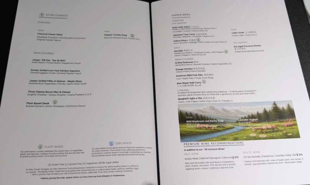 For supper we were in the recommended late seating, so we again opted to sit with someone as there was limited space for just two. It was the two ladies from Steamboat, Colorado that we sat with on the charter flight down to Ushuaia, Argentina. They are lab technicians and both had done traveling jobs. It made for good conversation as we ate. I had a Mushroom Barley soup with a main of Seabream Fish with roasted potatoes, carrots and parsnip (not a fan of the latter). Jeff had a Horiatiki salad (similar to a Greek salad) with a main of BBQ Ribs, onions rings (X2), piece of corn on the cob, and coleslaw. Jeff and I also shared a dessert of chocolate peanut butter cake. Overall great supper, but the cake was probably our least liked dessert dish so far…just lacked flavor.