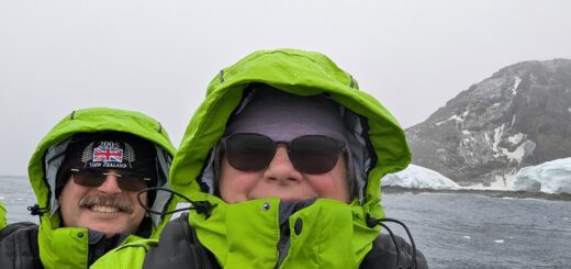After lunch we went to the Dome to whale watch. The view is still a gray sky “shrouding” that meets the darker gray water. There was a bit of rocking and rolling, but it is not affecting us, and we’re not needing to take Dramamine. We did spot some icebergs, otherwise it’s just sky and sea. At 1330, we were rewarded with half a dozen whale blow spouts in the distance. Don’t know what whales they were, but it did happen.Yay! Then really nothing, so around 1600, we went back to our room. Wouldn’t you know, just 15-20 minutes later, Chad announced that an “iceberg off of our port side, that had broken off from the Weddell Sea had come to meet us.” We rushed back up to see it and were rewarded to see it!
