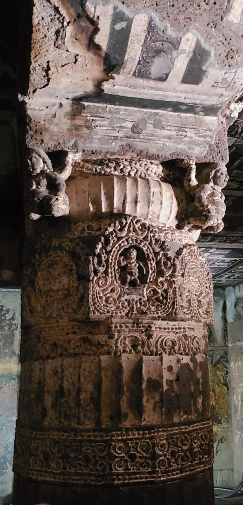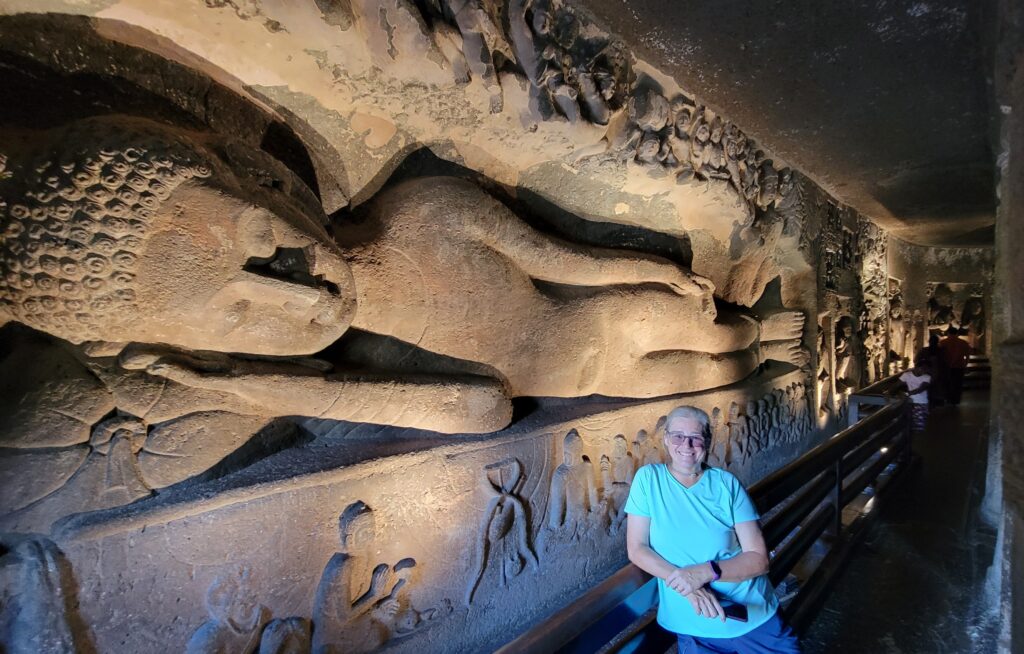 We weaved our way through the best ones first (did not know how long we would be). As you came up to each cave you had to remove your shoes. These first few we were almost speechless. To even have paintings left at all is a wonder, and then to be able to see some detail in that painting – well, it was priceless. After seeing the best of the painted ones, we backtracked through and saw the carved ones and the stupa ones. Fantastic and in some of these last ones you can see traces of white, a little red, maybe black (seems very dark green), and rare hints of blue paint. We went into all we could. Of, course some were just the main cave without any carvings, or paintings and had little cubicle rooms for the monks to stay in. There were also a couple of caves that were started, but not finished. This made it easier to see how the monks made the caves. And a side, we saw monkeys. Cheeky little monkeys, always scouting for a handout.