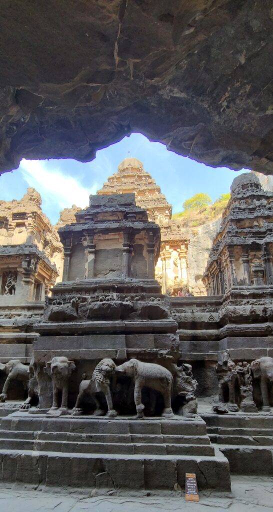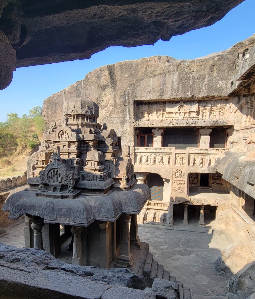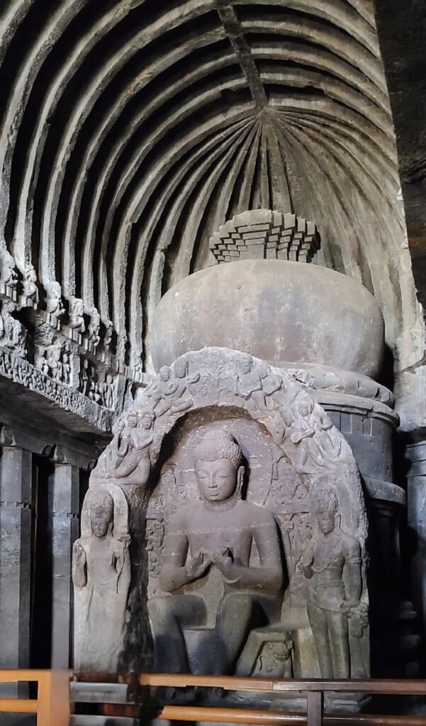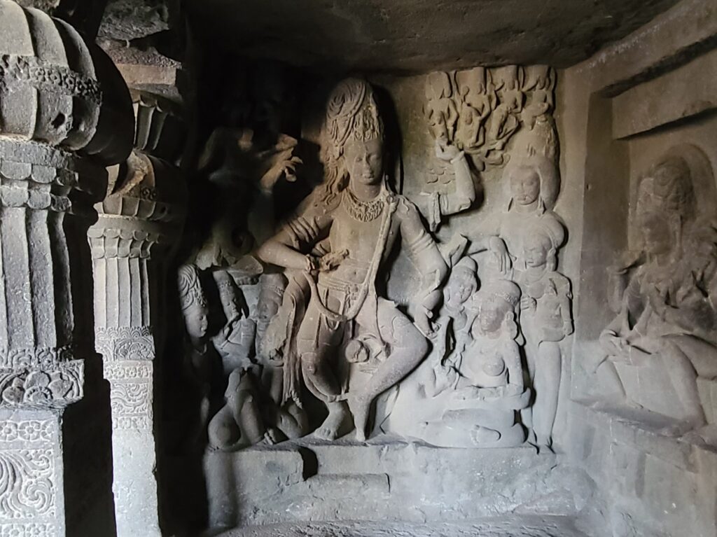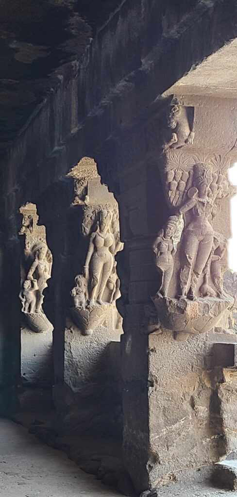 Then cave #33. Where there are more great carvings of gods and animals, with traces of paint still visible. Next cave #32, 31, 30… and the same… it was incredible: more paint was still on the carved gods, columns, ceilings and walls. Some caves are now dating from 10-14th Century. These caves also have second floors and link into each other.