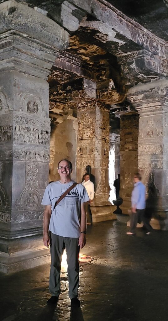 Then #16! Oh my! It was by far the best cave of all!!! How to describe… words fail, but I will try. First Jeff knew enough to climb up on the rock these caves are hewn out of. (The Indian Archeology group built steps and walkway around this cave, because so many have done this.) So we started with a bird’s eye view first. It is massive. There are, I think five separate temples, with different carvings and rooflines. The one at the very back is largest and they staristep down in size to fit with the rock face is hewn from. There are many elephants and lions, plus so many idol gods… so intricately carved. Some traces of paint is sti