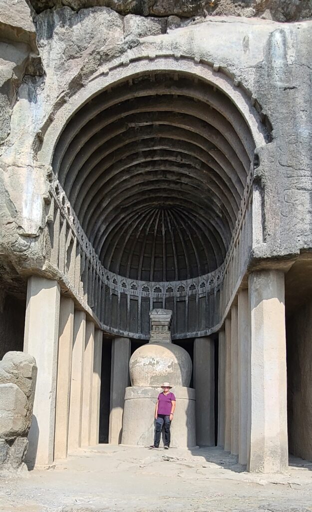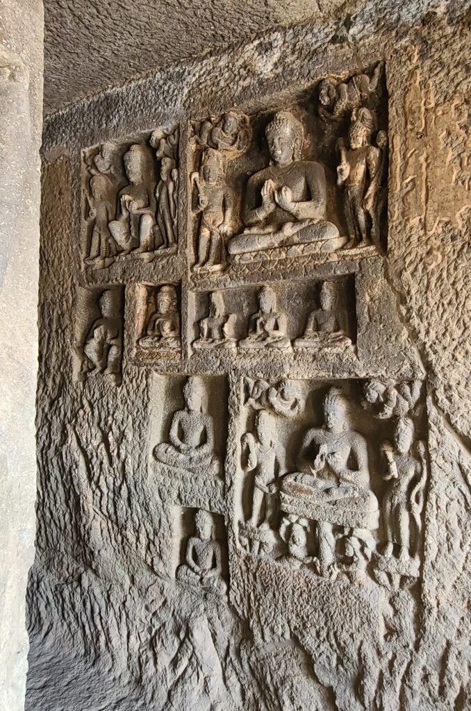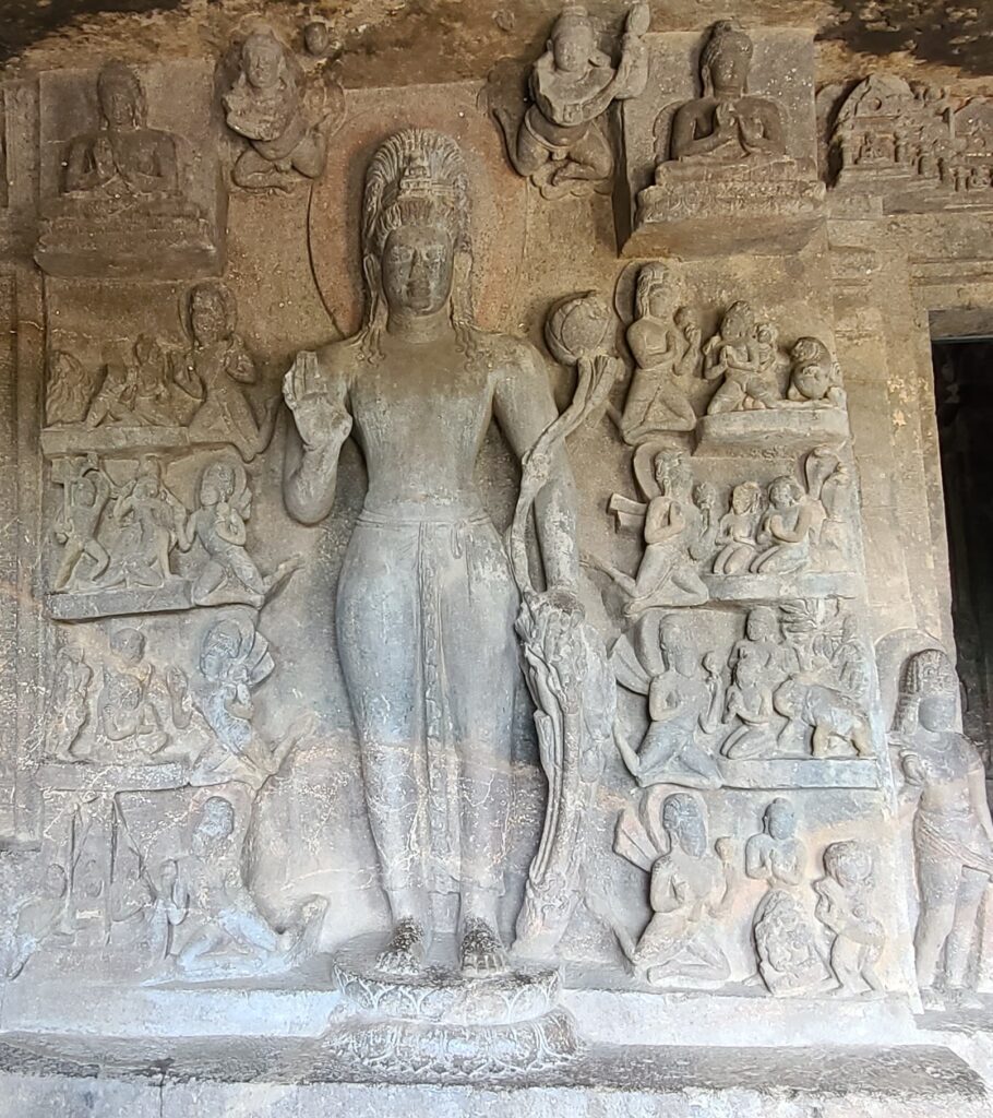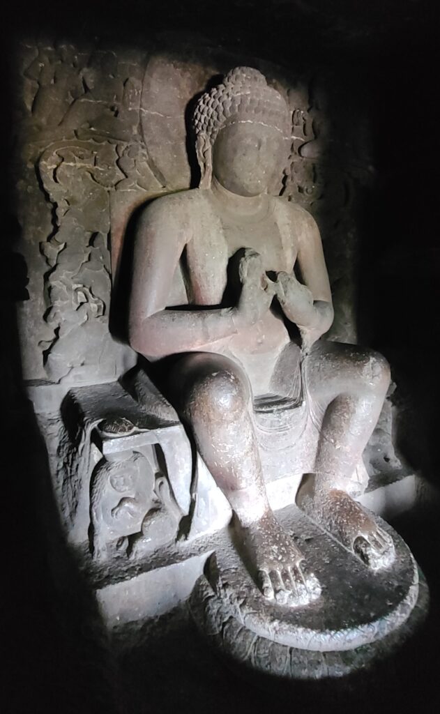 Then we went by our tuk-tuk to the second section – #6-9. Cave # 6&7 had great carvings. #6 had an alcove with Ganesh, the elephant (and a Hindu) god, next to a Buddha (obviously, Buddhist). Maybe an attempt to merge religions??Questions?? Anyway, #7… well this maybe the best of the Aurangabad Caves. It has a verandah, with a chapel, a central sanctum, and cells for the monks – it was a monastery.