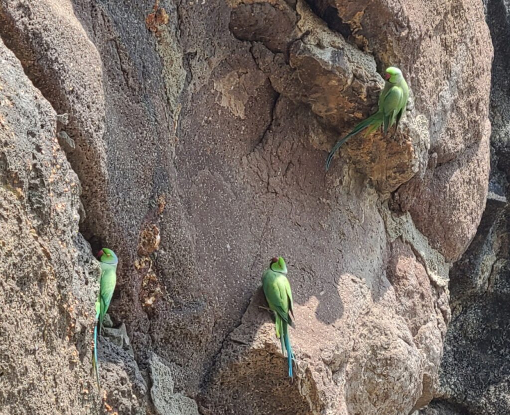 Then I had an brief interlude – parakeets. They were flying above us to the rock face and chipping at it with their bills (salt??). They are so brilliantly green with blue tails. Caves #8,9 were not completed much at all. #8 was started as a two story temple, but second story is not accessible now. #9 has an unfinished reclining Buddha and a few other great carvings. There was an impressive vein of quartz in a pillar of this cave. We went to cave #10, but it is only a hewn rock area- no carvings. so we went back to our tuk-tuk. (#11,12 are not accessible at all.)