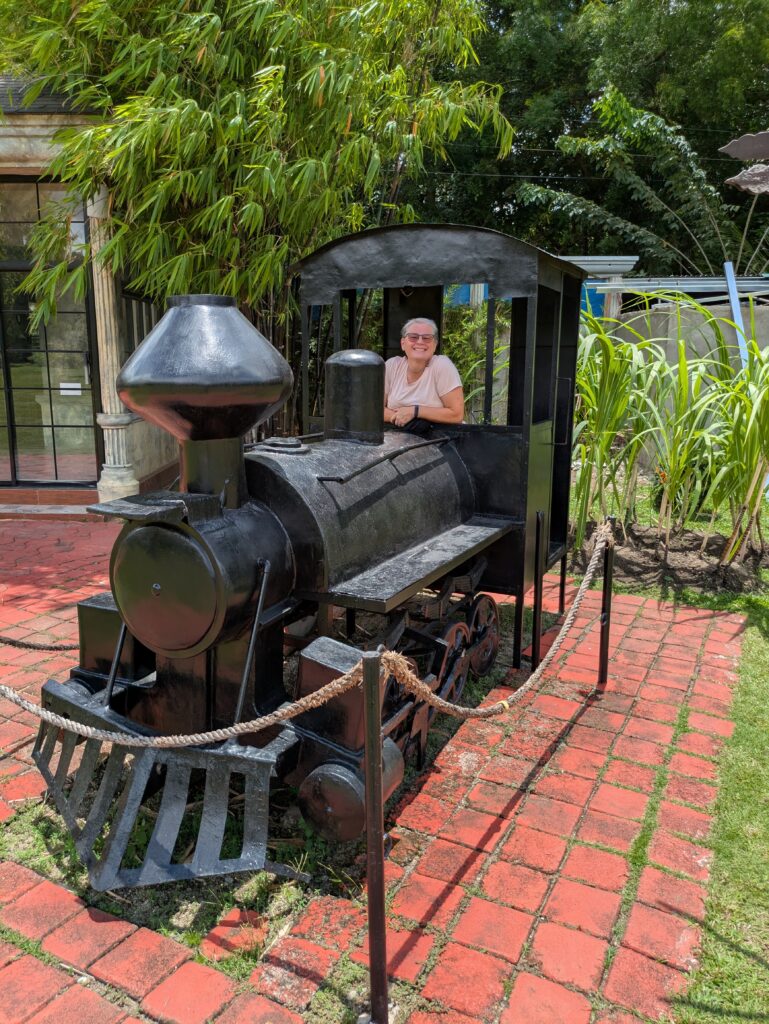 Anyway, They married and had ten children. Maria was said to have died while carrying their eleventh child. Don was devastated and set about building this house dedicating it to Maria. His Father-in-Law, Maria’s dad helped him. Then Don and the ten children lived here, until 1942. the place was torched to keep it from Japanese Imperial Forces occupation. The family moved to another place. Don never returned, dying in 1948. There was a lot of other info- the tiles on the ground floor are original; and the upper level wood flooring was two inch thick, one meter wide, and ran a whole length of the house around 20.5 meters long… without joints! The family has kept the ruined mansion, but never restored it. It was passed down through the family by lottery, until a great grandson became owner and has turned it into – The Ruins… a tourist attraction, a cafe, and a venue. We also walked the yard of the mansion- you saw the outdoor area where they could set up a wedding. They had a locomotive engine from the olden days to haul sugar cane out of the fields. I could go on, but suffice it to say we were impressed and enjoyed the place.