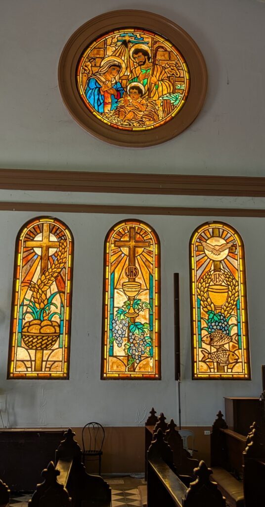 We left here and went into the town of Silay. We went to San Diego de Alcala, a pro cathedral, which means it is a Catholic parish church acting as a cathedral.(? I don’t know enough to go into this more.) It was built in 1925 and has a rare dome over the transcript area of the church. It gave a very different – airy – feel inside of the church. The church had some nice stained glass. We loaded onto Lauren the scooter, and found some of the town mansions on a street. We just glanced at them, all in various states of repair. We did not go into one, as we think we had toured a very nice one in Cebu.