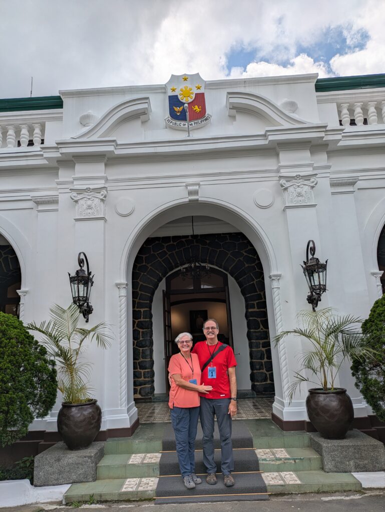 Anyway, we arrived via the taxi right at 0930. I took photos and lost where Jeff went. The guard pointed to Jeff and said, “Is he your Neighbor?” I was puzzled🤔 briefly then realized what he was saying. I said, “My husband?… he’s my husband.” He corrected himself, “Sorry, mam, your… husban?” I nodded, not correcting his mispronunciation, and smiled. Anyway, we were directed into the information center to wait until our time slot. Here they reconfirmed our tour. They needed ID to make sure we were who we claimed to be… It is a governmental building after all. It was also a free tour, and we found out we were the only ones for the 1000 time. So it was a private tour to boot! There was a cool map of the Philippines from 1734 that was drawn by the Spanish. It was a replica – seems the original sold in 2014 by Sothebys for then 12,014,463.09 PHP, (which would have be a lot, and I don’t know the equivalent amount). We were then offered a golf cart ride the rest of the way up the drive if we could not walk it. We walked of course.