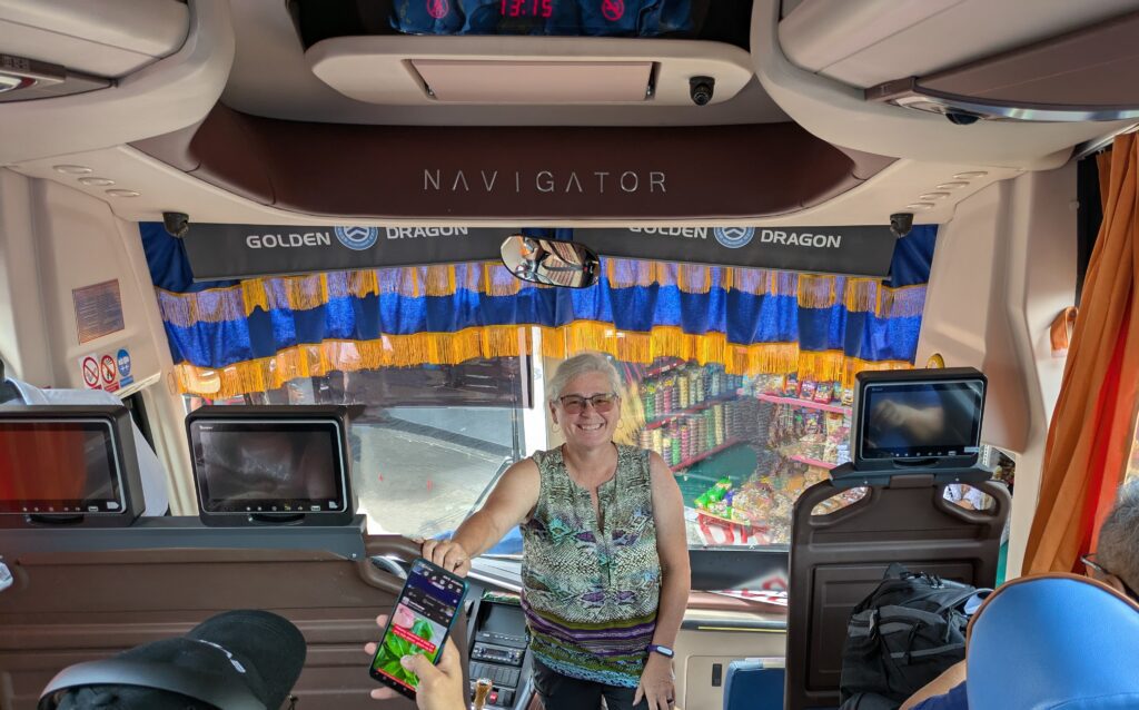 Jeff E-hailed a Grab taxi to the Joy Bus terminal. I did ask the driver, as we were going, how many taxis are in the city of Baguio. He said, “Just under 5,000, mam.” We knew we have seen a lot of them… and this does not count the Jeepneys! Crazy! We arrived and parked ourselves in the waiting area for a long sit. Around 1230, Jeff went out to get us lunch at Makatata Smash Burgers and fries. Finally at 1310, we boarded our bus. The fare for this ride cost 670 PHP, which is $11.70. The time going was supposed to take 4 hours, according to the lady when we booked the tickets; but the ticket taker said we would arrive at 1630. That’s only 2.5 hours!🤔 Anyway, at exactly 1400, the bus backed up, on time! The driver only stopped three times: for a money collector guy(?) to board and be dropped off after everything was sorted; third stop was to drop something off to a teenage kid – a son of the driver or ticket man, maybe? Then the bus went on the nice highway, and we moved. The drive is covering much of the same way we route, except faster, that we’d come arriving to Baguio. The only thing of note – when we started, we were driving though some of Baguio we had not seen, because when we arrived it was dark. It was hard to believe there was so much more city on the other side of yet another mountain.