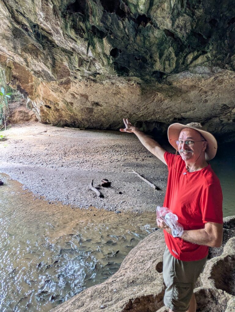 We finally came to the second stop – Nam Lod Cave. We parked and paid an entrance fee for Jeff and I, and for our Yaris to be parked – this was 300 THB ($9.15). Then we bought some fish food for 50 THB ($1.53). We were assigned a guide, as it is required. Her name was Nam, and I found her very considerate. She carried a Coleman lantern as all the guides do. I could smell the kerosene and it brought back camping memories from my youth.🤔 As we walked to the cave we were along a stream and there was a herd of cows moving along the stream from one pasture to another. They were all wearing bells.