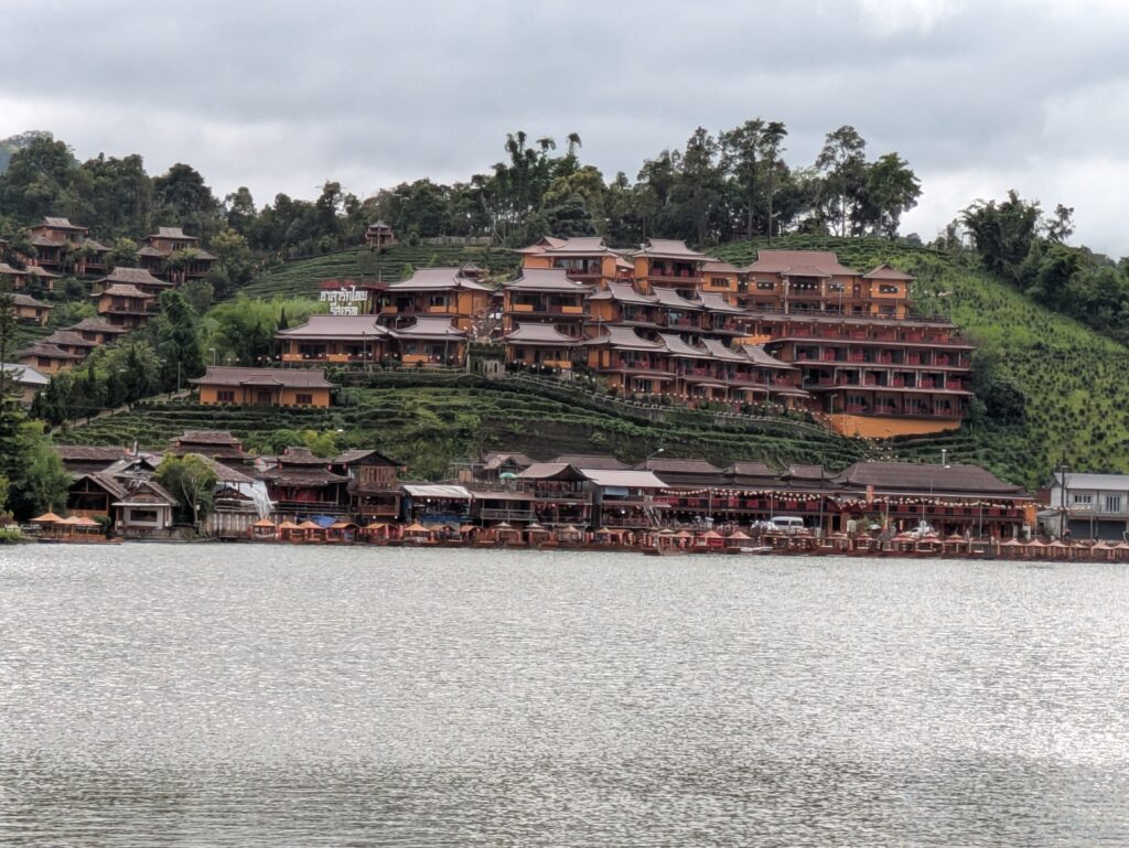 By 1600, we arrived in Ban Rak Thai and got checked into our accommodation for tonight, Chasa Rak Thai Resort. The place sits on a hillside tea plantation, overlooking the small village and its lake, Mae Sa-nga. It is very picturesque. We unloaded and went down to the lake. We walked around it and found a free wine tasting of Thai local (non-grape) wine. We tried three kinds: a gooseberry, a dry plum, and a peach. We actually bought a bottle of peach wine, surprised us both. Then we found a supper place, Ban Din Cafe. We had Fried Sun-dried Pork, Fried Mushrooms “With” Sour, Rice, and French fries. Jeff had a beer; I had strawberry tea. It was great food. We did not really have lunch. The bill was 590 THB gave 600, which was $18.31.