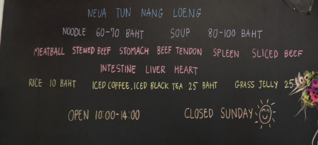 Now we caught a bus. Once off the bus we had a short walk. We found our food place: Neua Tun Nang Loeng. It was recommended by the Roaming Cook, and of course it is in a back alley little food area. We are here for Beef Brisket Soup! The owner, running the place now, has been here 22yrs – his Grandfather came from China in 1946 and started the business. He is very friendly and took our order as well as serving us. He pointed out his dad who he said lived in Arizona with his daughter for a bit. His dad gives out the bill and collects the money. The owner is great, very nice and super friendly, as Thai people are!
