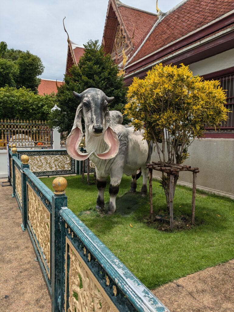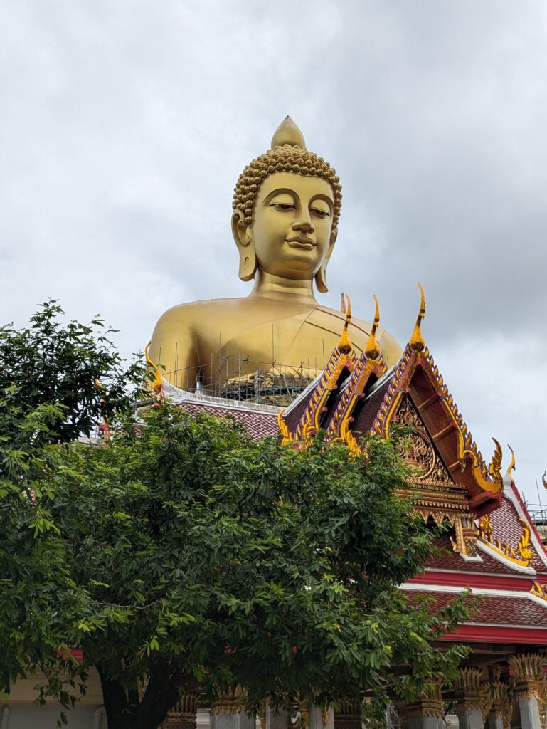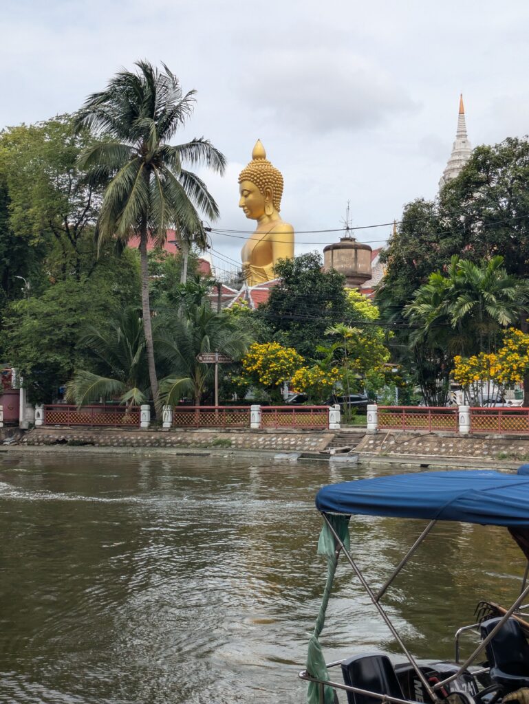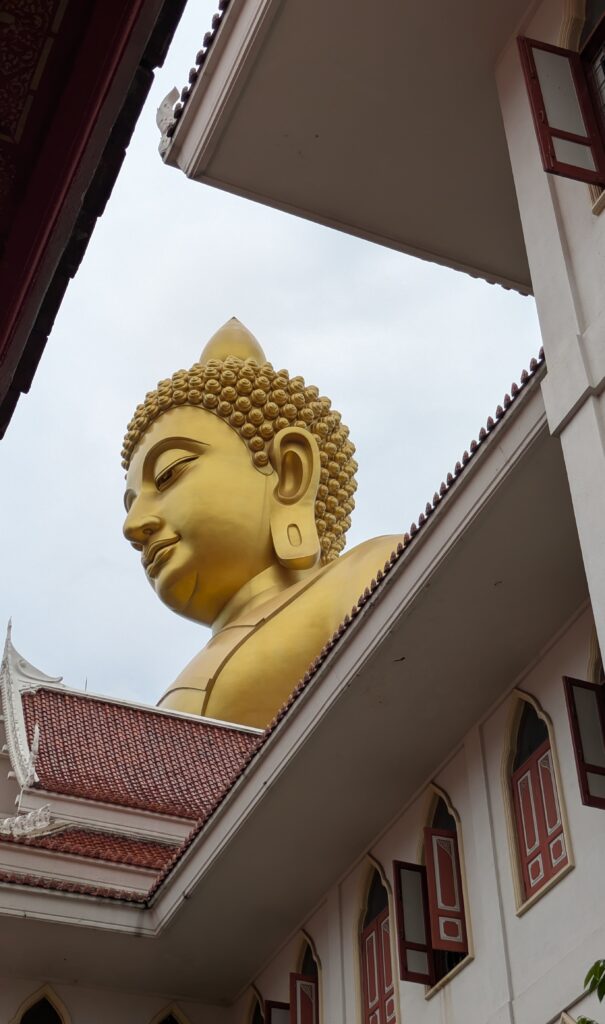 Now we left and walked to the metro. We took this to the giant, golden sitting Buddha and temple, called Wat Paknam Phasi Charoen. Unfortunately, now there is scaffolding enveloping the bottom 1/2 of the statue. It was not around it we we first arrived in Bangkok. We went on as we were committed now. I’m glad we did. It is impressive and well, big. But inside of a white stupa-like structure behind the Buddha is a museum(?) of sorts. There were all manner of inlaid wood pieces; small and big carved jade pieces and Buddhas – of all colors, including a purple jade; and everyday pieces of furniture, old typewriters… plus so much more. There was not any English explanations to who this belonged to or what it symbolized. Was it the King’s possessions? What’s the significance of old typewriters? I could go on — so, so many questions! We went up to the fifth floor – which is the last we are allowed to go to – and saw a really cool domed area of a heavenly realm(?) with sitting, painted Buddha figurines encircling the bottom. Next we went outside on a great look area, out over the temple complex, the back of the huge sitting Buddha, and Bangkok, in general. From this vantage, we also took in a canal with boats motoring along with tourists. We climbed back down out of the stupa structure, and made our way out of the temple.