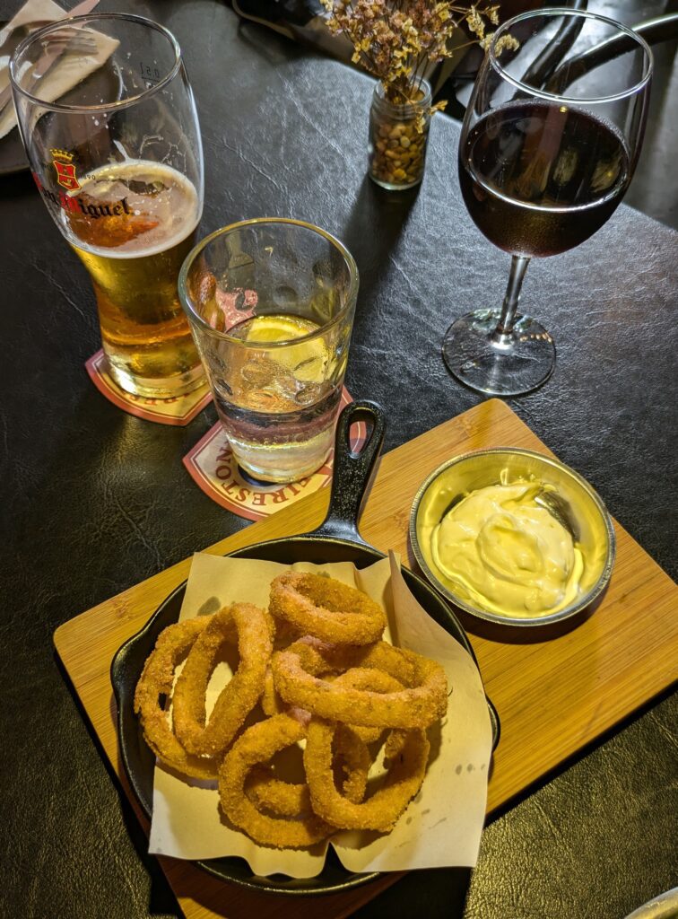 When we awoke – we knew our food destination, so we skipped breakfast. We wanted to be hungry! But we did catch a swim session before it started raining. Just before1200, we caught the Moniiq shuttle. We were let out at the BTS station – as per normal – but we deviated and walked a little walk to — Devilish, Smokin’ BarBQ Shed- Man Meets Meat & Smoke! The menu advertised “American Low + Slow Barbeque!! Alright- let’s check it out. We ordered a Brisket Solo Feed, which was 200 grams (7 ounces) of 14 hrs, smoked brisket with hot chips (fries) and coleslaw; a Pulled Lamb Chip Bowl, which is hot chunky chips (fries) with chicken salt – loaded with pulled  lamb, Tzatziki, Feta cheese, red onions and Kalamata olives; and a starter of Gourmet Onion Rings with a garlic Aioli dipping sauce. I had a glass of red wine and Jeff had a different- new kind of beer.