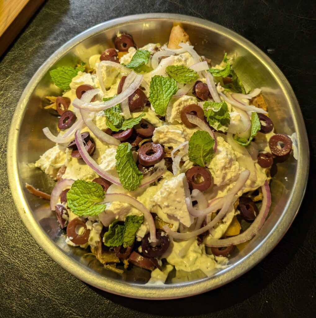 The onion rings came out first and were hot and crunchy good with that sauce. Next came the pulled lamb bowl. It was loaded with shredded, pulled lamb and lots of Feta. The Tzatziki was creamy and thick, and there was even mint leaves garnishing the top. Very good! It has been awhile since we have had lamb! Now, came the Brisket. It was so tender and smokey — YUM, making my mouth water as I write this! The rub was a great balance for the meat and had a BBQ dipping sauce!! There was also a spicy dipping sauce, which if you dipped the tip-tines of your fork in that was plenty!! Just saying! There were even pickle slices and Thai pickled onions. The fries are the thick steak fries, but so good with that Aioli sauce. The coleslaw was too sweet to our liking – so we added a dab of the spicy sauce, that improved it! This meal was comfort food for us! At one point, I thought I was in Kansas City… it was very brief, but WOWZA!! Definitely YOU can get any kind of food in Bangkok! This meal was pricey… 1740 Baht ($49.32)! That included a small tip. I did strike up a conversation with the main guy, and told him we were from America and that it very much reminded us of home BBQ. This seemed to make his day! We hope to come back, but our time is running short? Maybe Sunday??