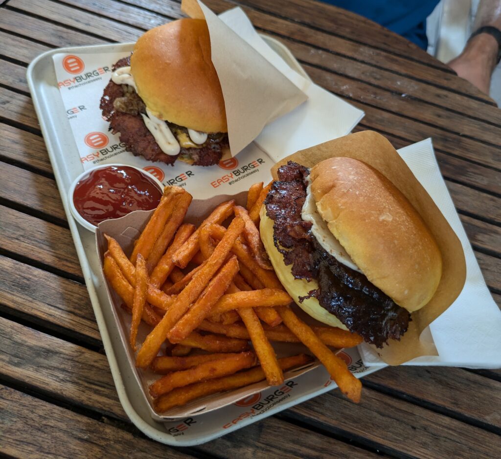 Today we started with breakfast of some sweet (unfortunately) fruit and seed crusted rolls with pepperoni, and a yogurt each. Then we did a load of laundry. This washing machine has an option for drying also. It just takes a lot longer, but it works, mostly (we don’t have to have our clothes all scattered out too long to finish drying, anyway). Once the laundry finished, we went out for lunch. The place we had in mind… we remembered it closed at 1400, so we were not going there. We thought of another place, but we weren’t hungry enough for that one, so we opted for hamburgers.