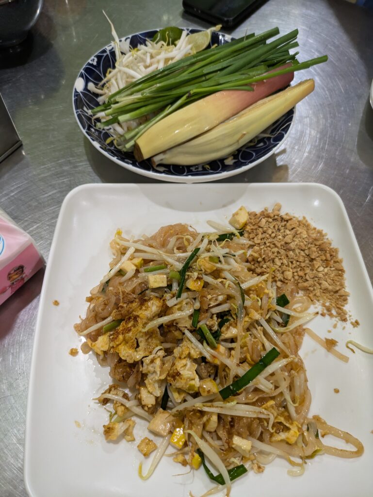 We awoke and had our morning coffee/hot chocolate. Looking at places to go today, we decided on some Pad Thai. Our favorite You tuber, The Roaming Cook had a couple of videos on Pad Thai. We skimmed the videos and chose one. To get there was taking Moniiq’s shuttle – to the BST; riding this to a local bus stop and waiting for the bus; then riding it; and lastly walking a bit. Total was 15 miles away, but it took us around two hours to get there. The place was Pad Thai Baitong, a very local mom and pop ran shop. It was established in 1980. The cook was a lady and she did not speak English. Her husband spoke English and Jeff told him two Pad Thai’s, but no shrimp due to allergy. He understood and told his wife, the cook. She set to work on our order using a Wok over HOT-flaming charcoals. She let me take a picture of her working. Fantastic. As she was finishing it up I showed her husband The Roaming Cook. I think he understood that was how we came to be here. The food was again so good! I love me some Pad Thai!! And this was, to coin a phase, next level! 😂 We were also served a bowl of Thai chives, bean sprouts and banana flowers, which you can add on top. It was beautiful, but even better eating. Finished we thanked everyone, paid, and left so happy (we also had X2 small waters). It was 150 baht ($4.15).