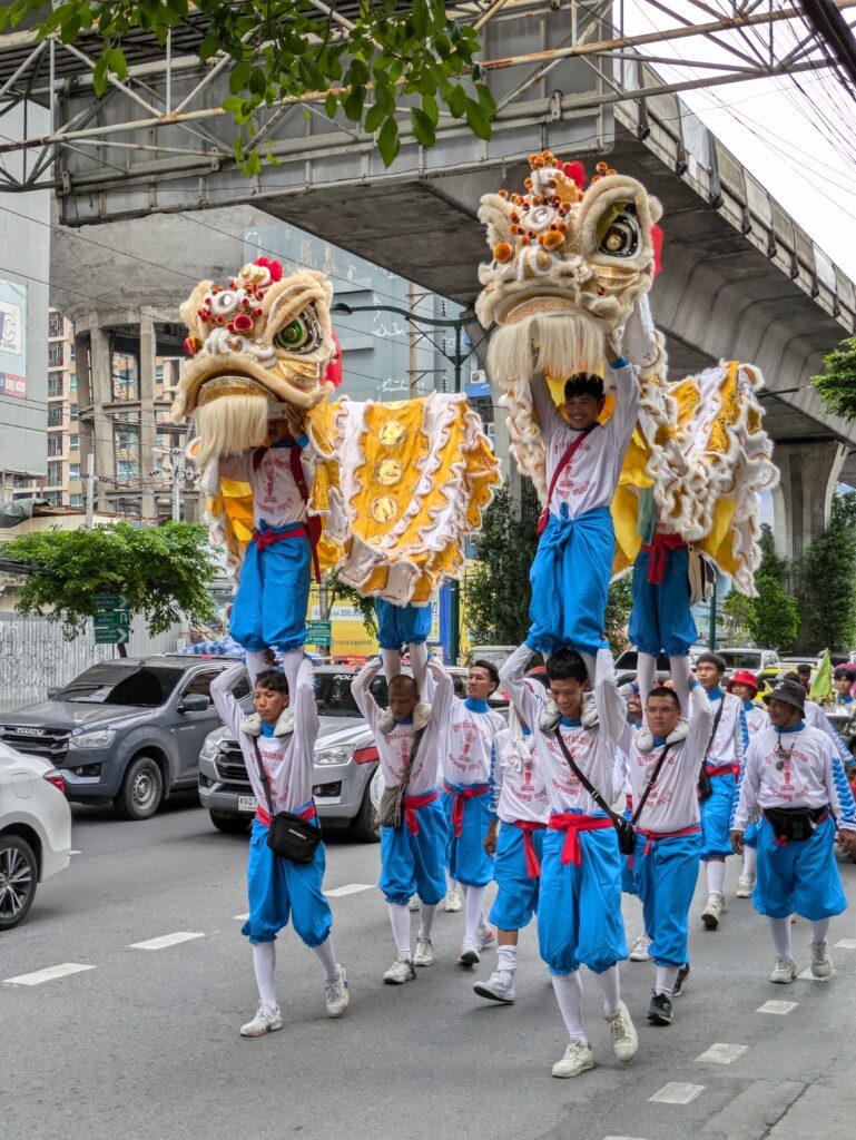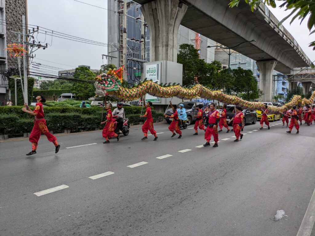 More than satiated (we were happy) we left and went to a nearby mall to find a new sling bag/backpack as our old one is having issues with the main zipper. No luck, but we found a coffee roaster and I was able to get some great smelling coffee. Finished we left here and took a seemingly unending local bus (it took almost 1.5 hrs), close to our place. We stopped at the nearest large supermarket, the Big C. We picked up some light meal stuff for tonight and future. Loaded down – mostly water/drinks – we went to catch one more local bus, getting us closer to our place. While waiting for the bus we saw a “dragon parade” coming down the very busy street. I asked a local what it was about, and she did not know the English words but was able to relate going to the temple. Cool!