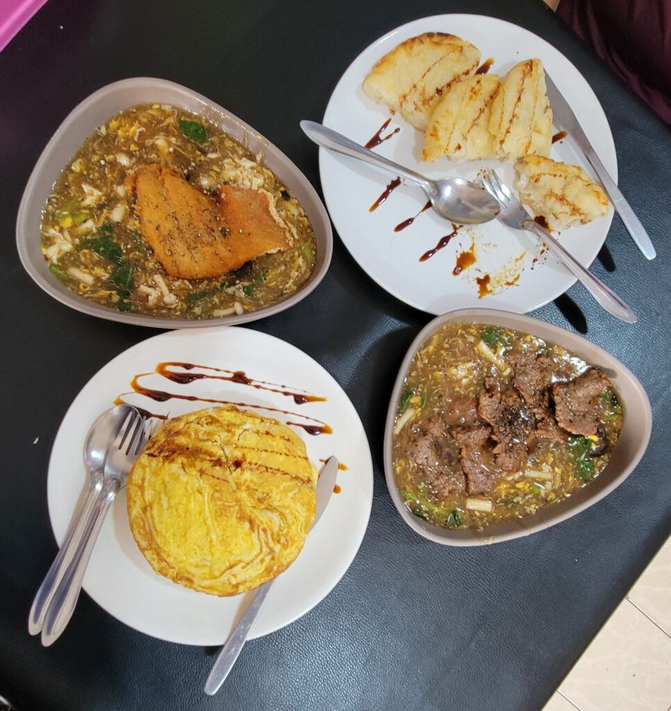 Well, first off, what we had: Rad Na, which is wide rice noodles (But these are pan-fried, wide rice Noodles – hence “Crispy”) X2, with one covered in egg; pan fried barramundi fish; and sauteed-fired beef! Now the cooking process. The wide rice noodles are set in a pan just big enough to hold them and then ladled in oil. Once the noodles are golden colored the oil is drained/scooped off the “cake” of noodles. Then the now whole mass is flipped. It was art just watching. More oil is added to get the desired crispiness. Voila! A crispy Rad Na – One crispy noodle cake! “Ama” was working on this as “her son” was doing the gravy to set the fish and beef in. Then Ama set about on the flank steak- high heat in a Wok with oil and nearly constant stirring, occasionally added flame to the wok from the burner to crisp the beef. Then, like that, first dish of the Rad Na (crispy) served with the flank steak beef in a black peppery, mushrooms X2, egg-ribboned gravy was served!! (“The son” had worked on this while I was spell-bound with Ama and her magic). (I totally missed the fish being done.)